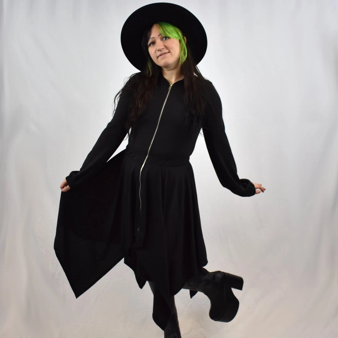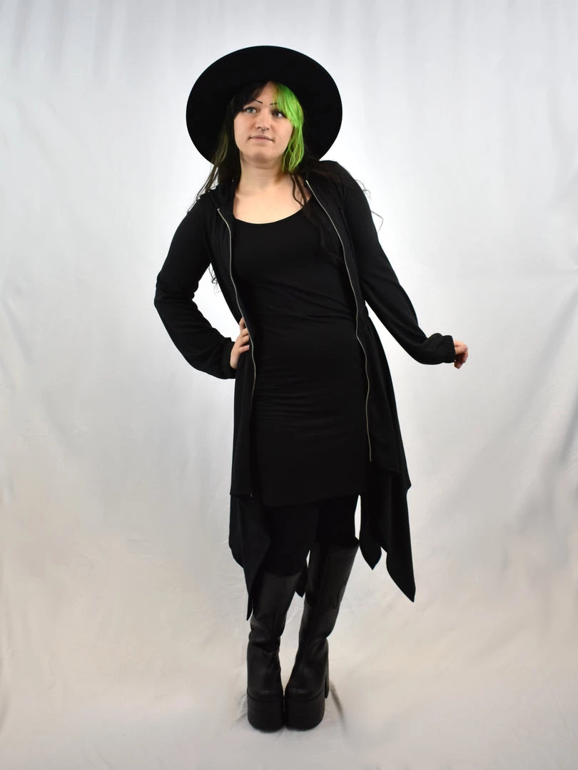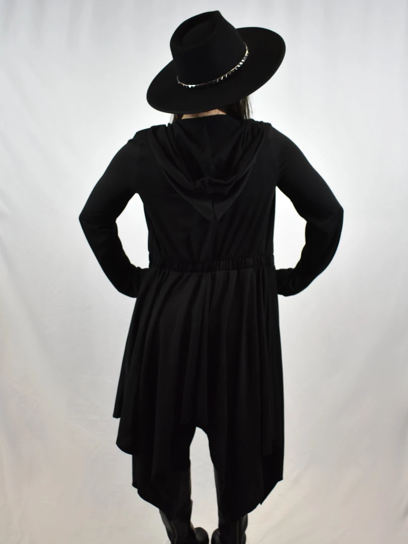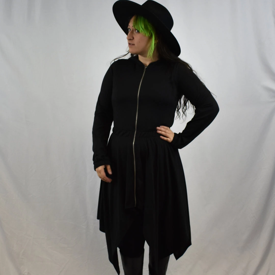 The exaggerated shark bite hem of this hoodie dress reminds us of the long sickle-shaped tail fin of the thresher shark. (The tail fin can be half the length of their body!) Featuring an elastic waist, hood, and full length zipper, the medium weight knit hoodie can be worn on its own as a dress or as a cardigan layer.