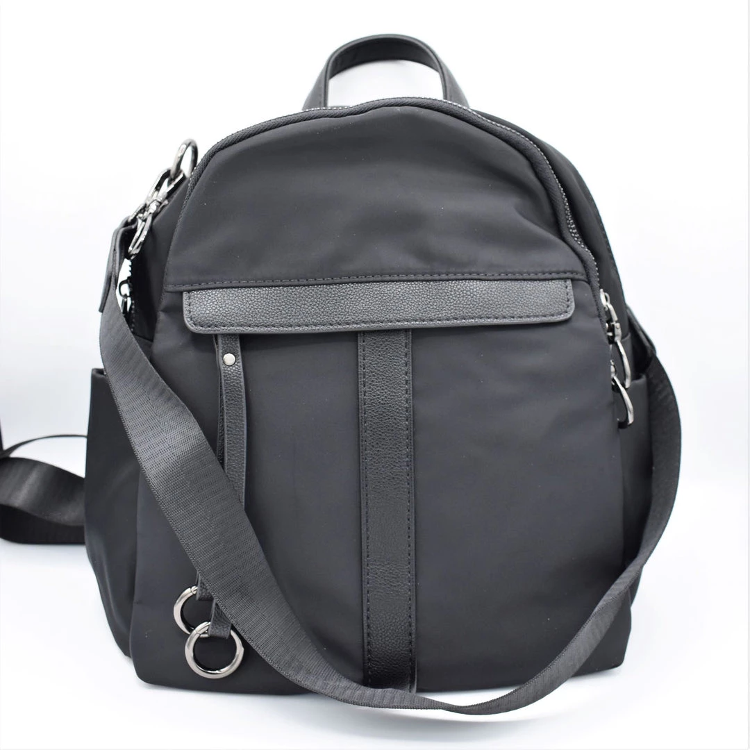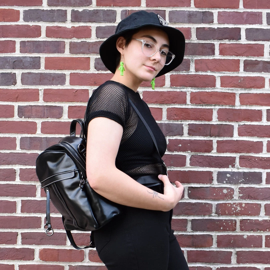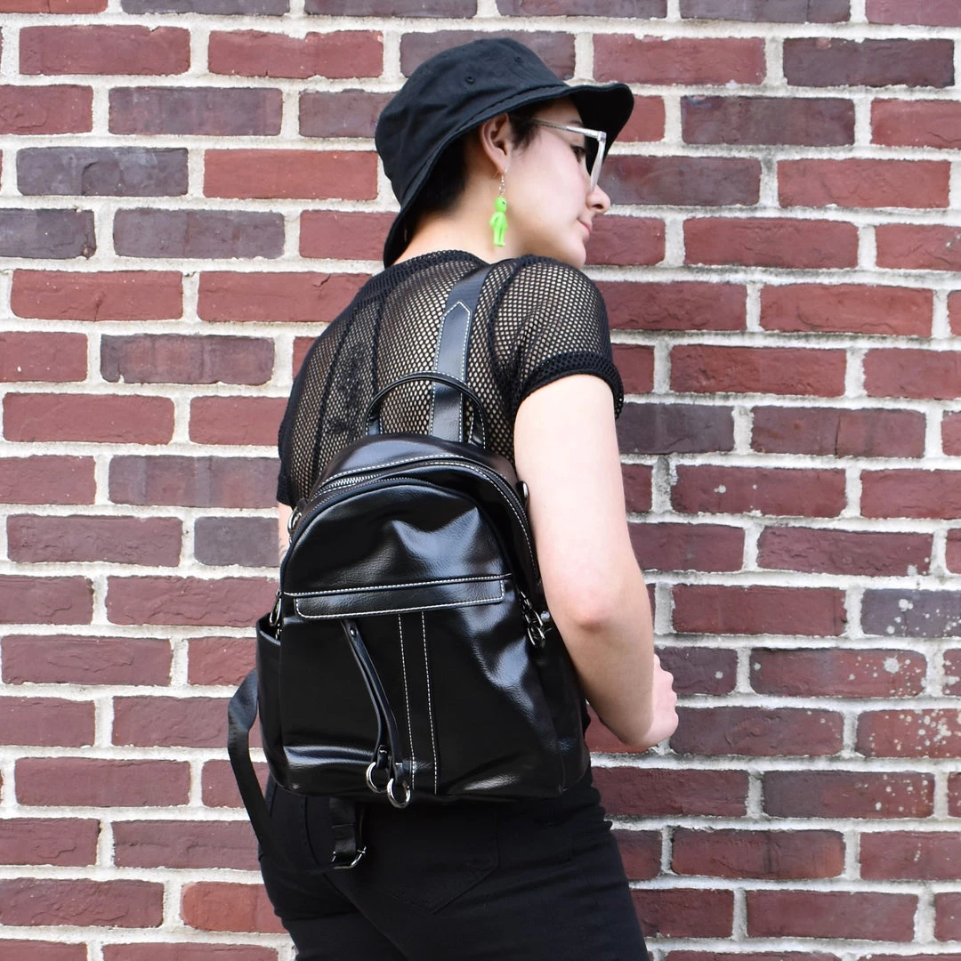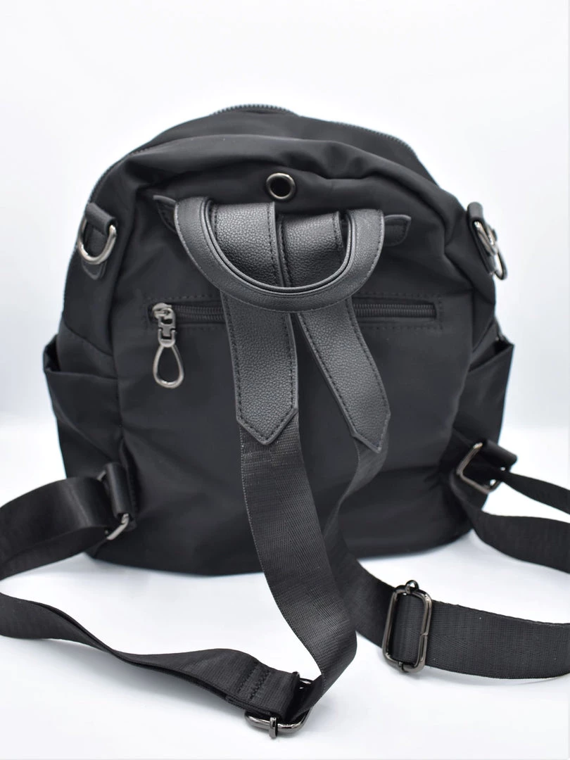 Two large zippered compartments. Main compartment has two patch pockets and a zippered pocket inside. Front exterior zippered pocket with double tassel and o-ring zipper pull. Back exterior zippered pocket. Two side exterior patch pockets. Adjustable backpack straps and removable shoulder strap. Grommeted cable passthrough hole for your headphones at the top of bag.