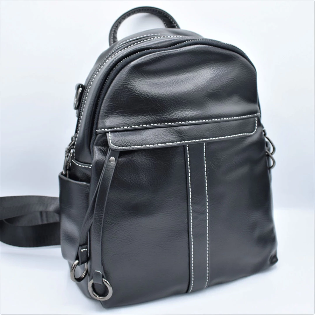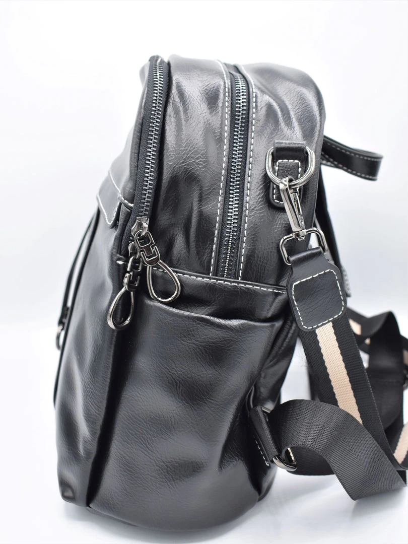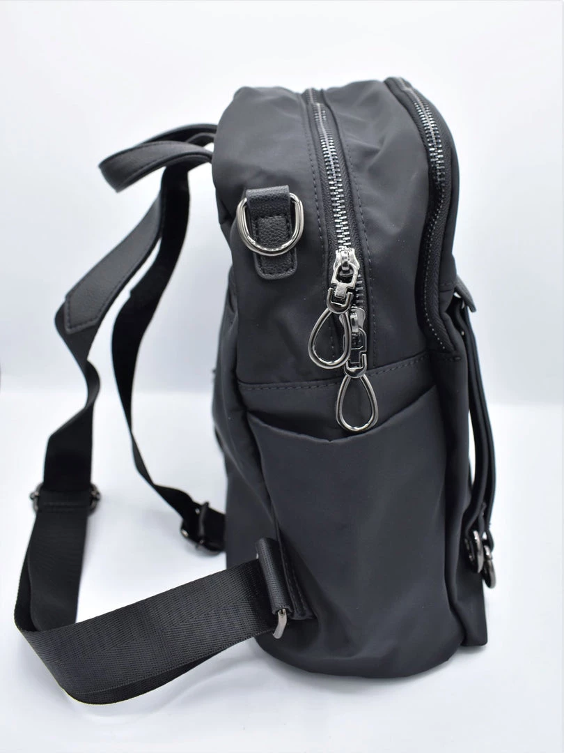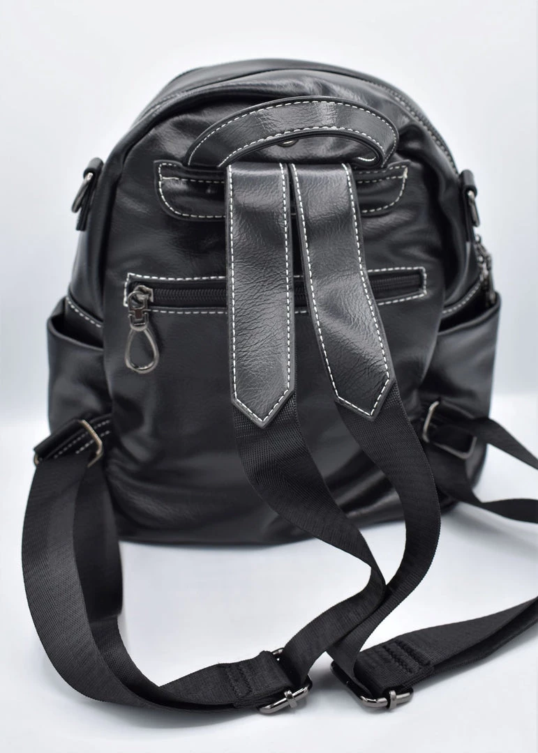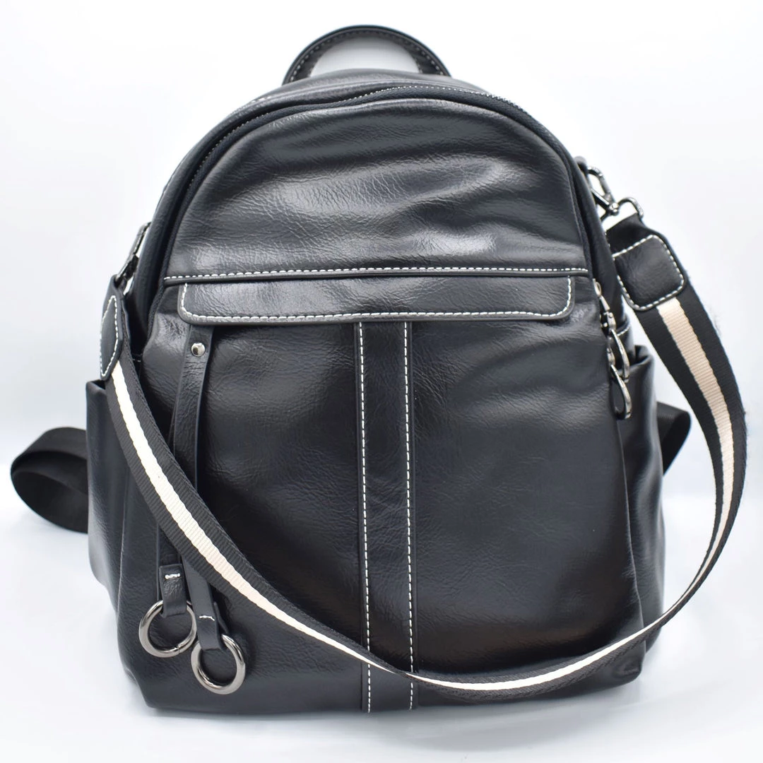 Two large zippered compartments. Main compartment has two patch pockets and a zippered pocket inside. Front exterior zippered pocket with double tassel and o-ring zipper pull. Back exterior zippered pocket. Two side exterior patch pockets. Adjustable backpack straps and removable shoulder strap. Grommeted cable passthrough hole for your headphones at the top of bag.