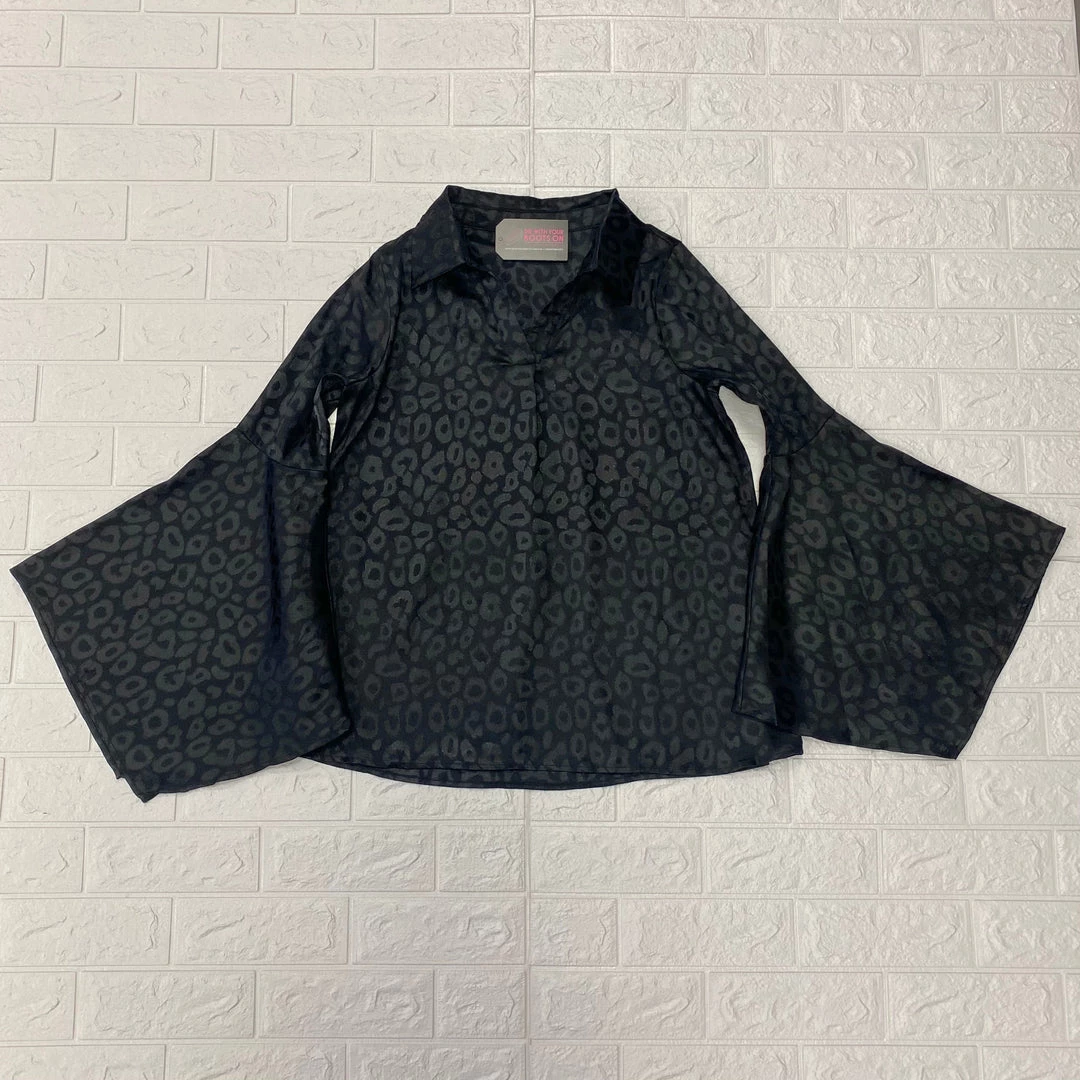 The ultimate feline. This black on black leopard print satin blouse features exaggerated bell sleeves and a split neckline with a pointed collar.