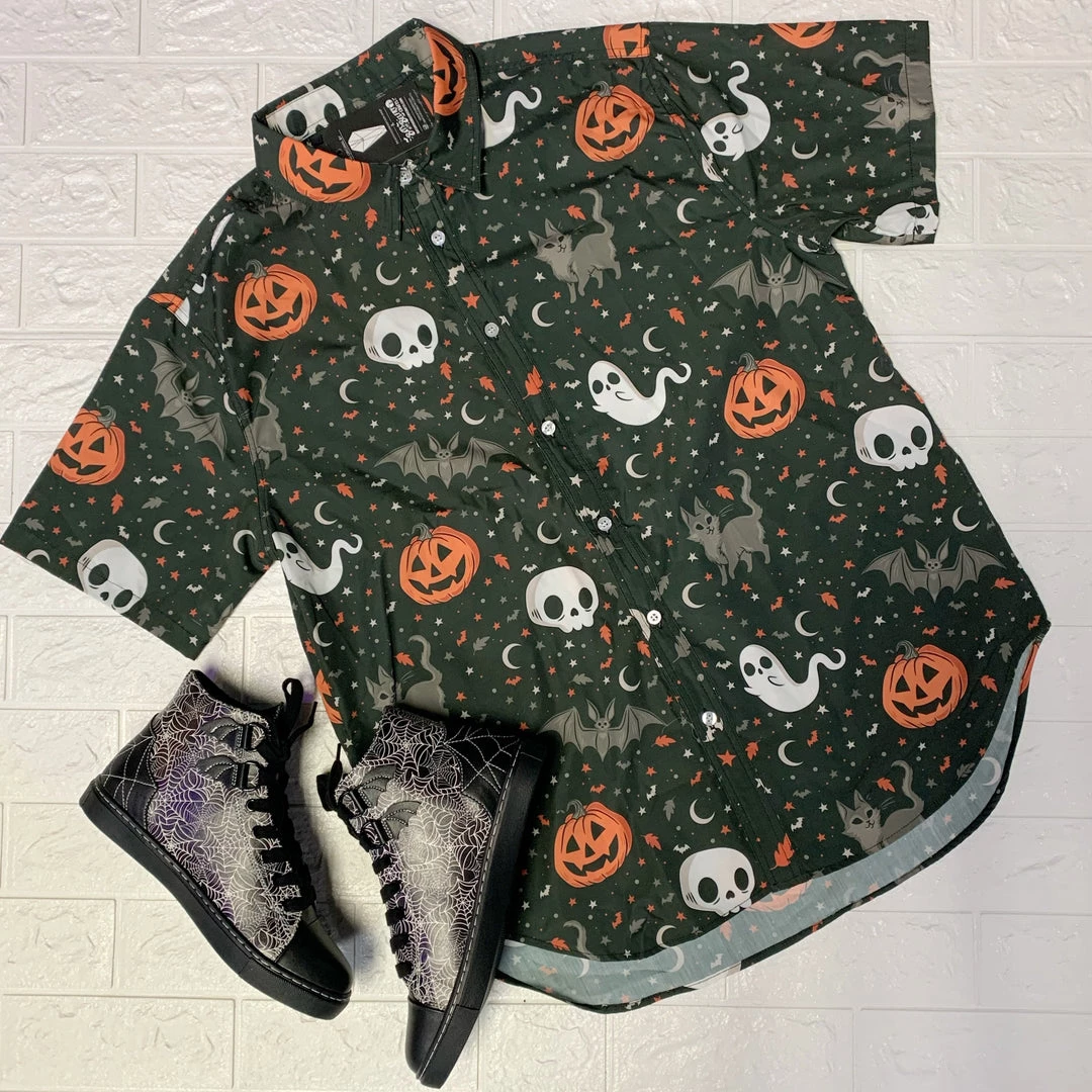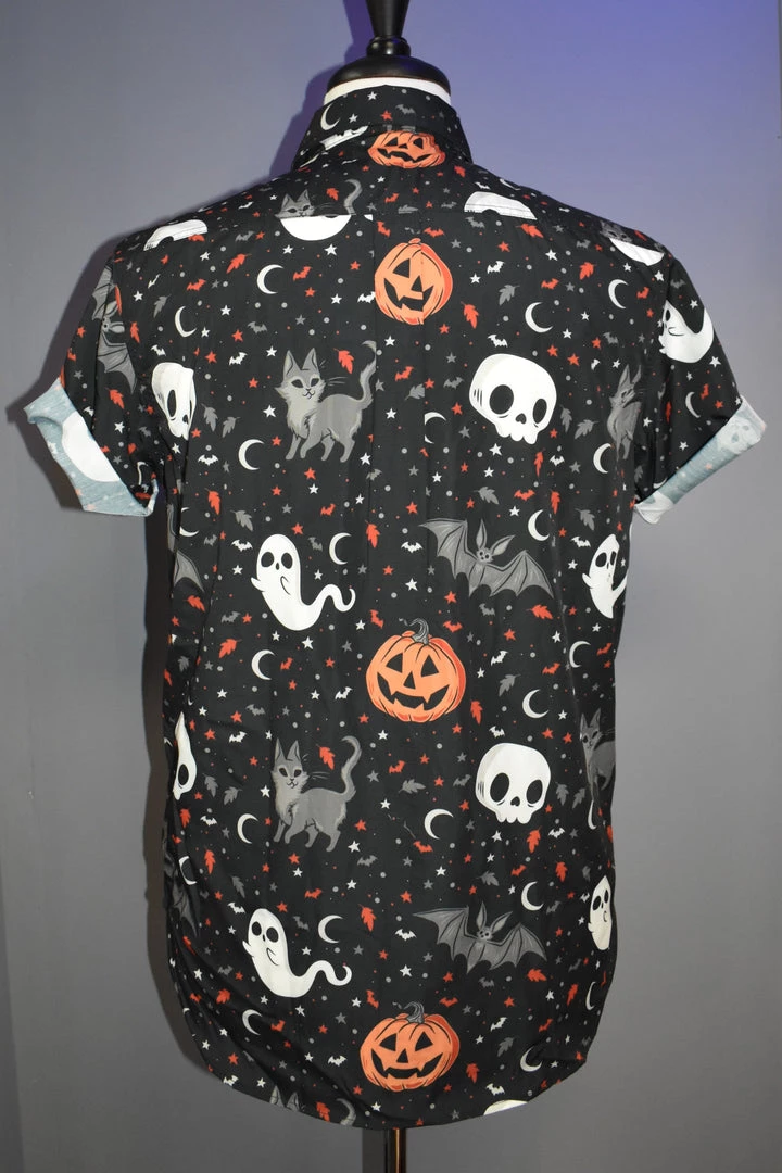 This short-sleeved button-up features art by our friend, the exceptionally talented Tiffany Leobell of Bats in the Belfry Crafts! It’s one of our absolute favorite prints with all the pumpkins, skulls, ghosts, and kitties you can handle! It looks great on everyone, so the sizing is unisex! We recommend sizing up, as this shirt does run small.