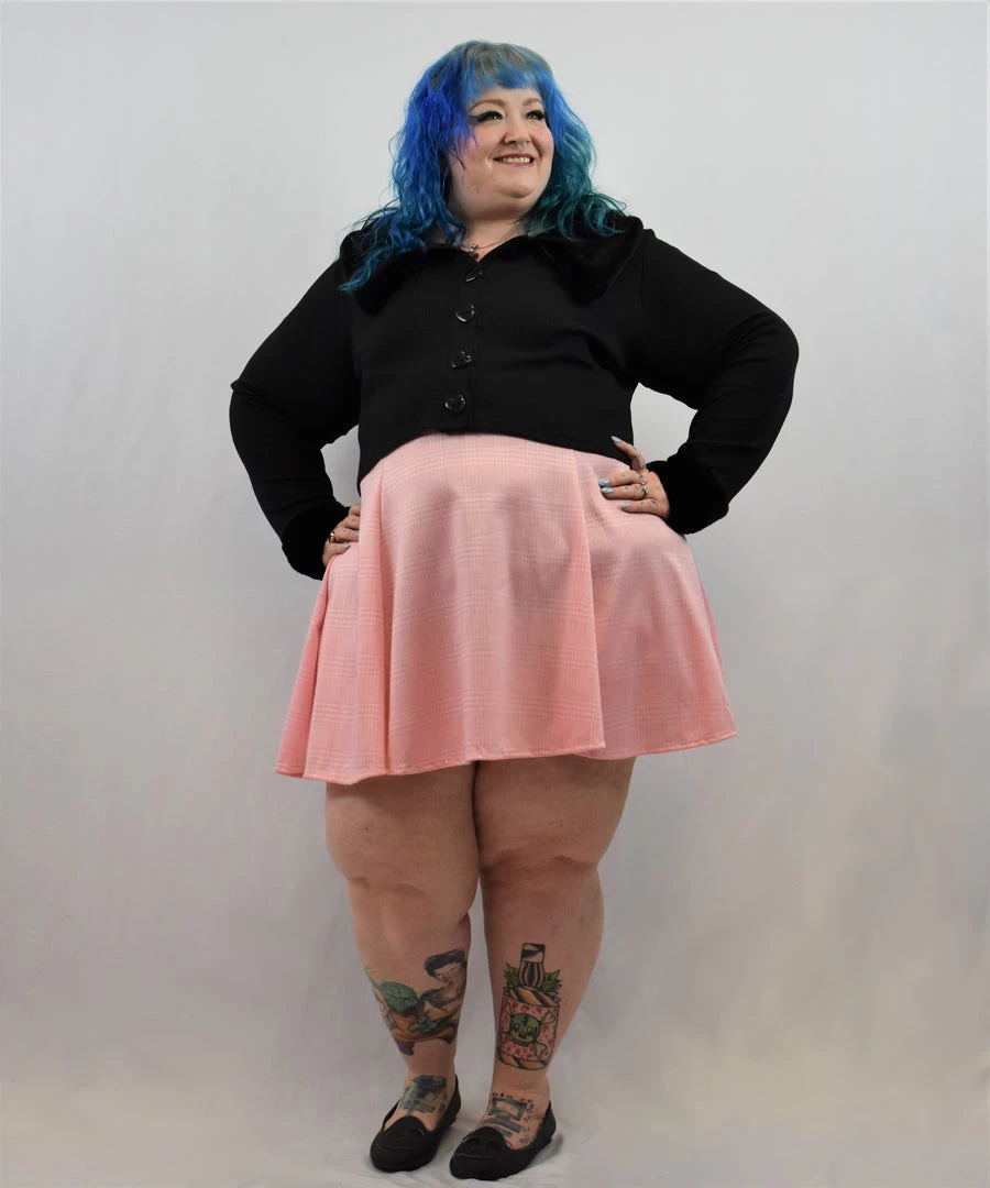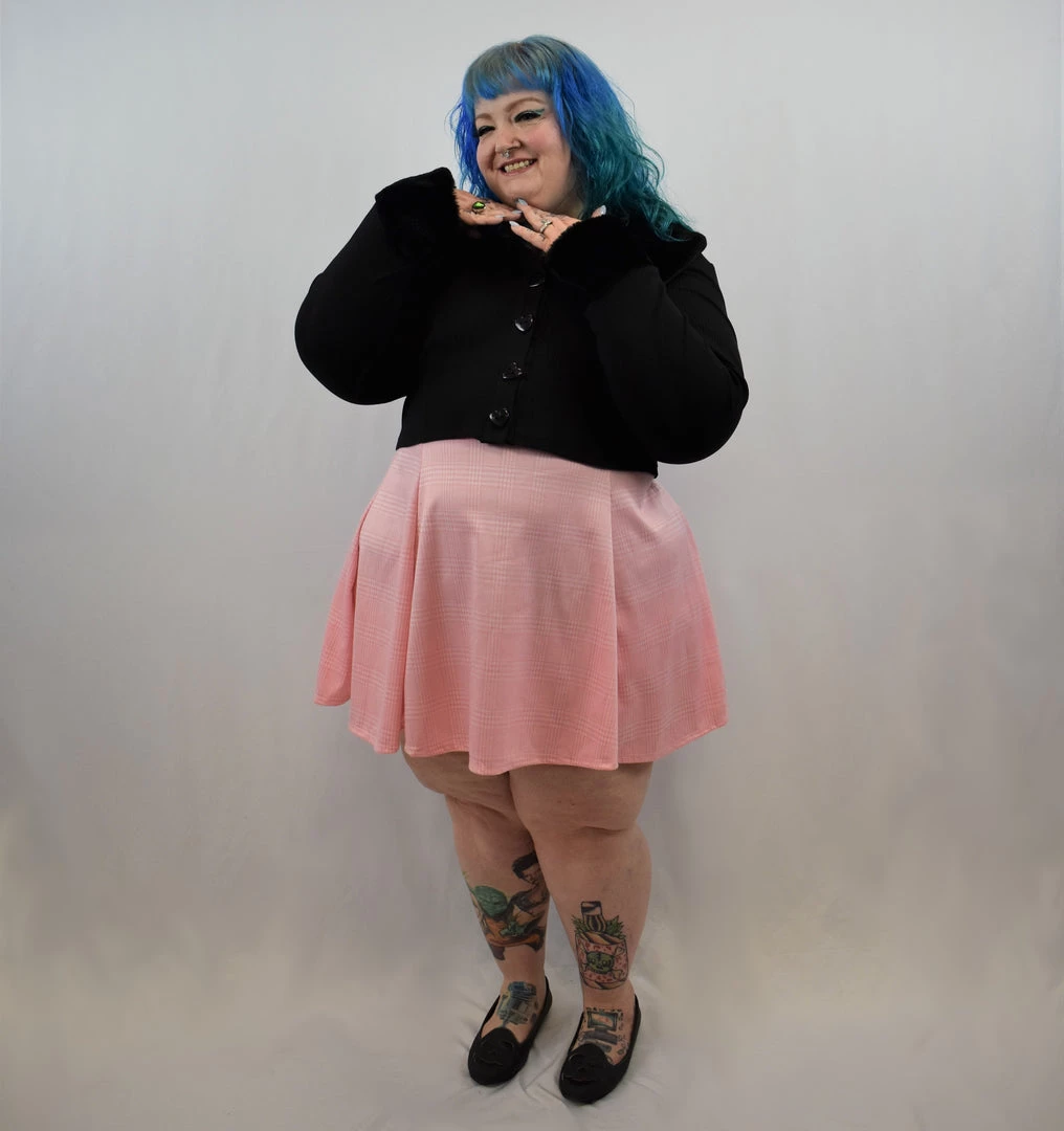Lightweight stretch rib knit fabric with soft faux fur trim and black heart shaped buttons.