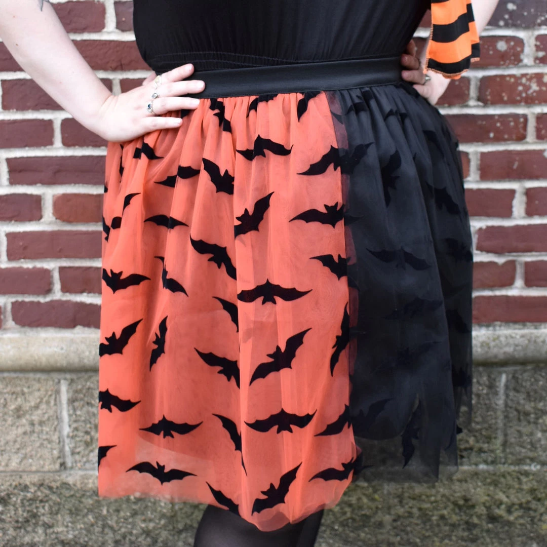 I love Halloween. It’s always Halloween in my soul… An easy elastic waist party skirt to dress up or down. Wear it split down the middle or all one color in the front! A FOXBLOOD original, with custom designed velvet flock print bats. Black lining.
