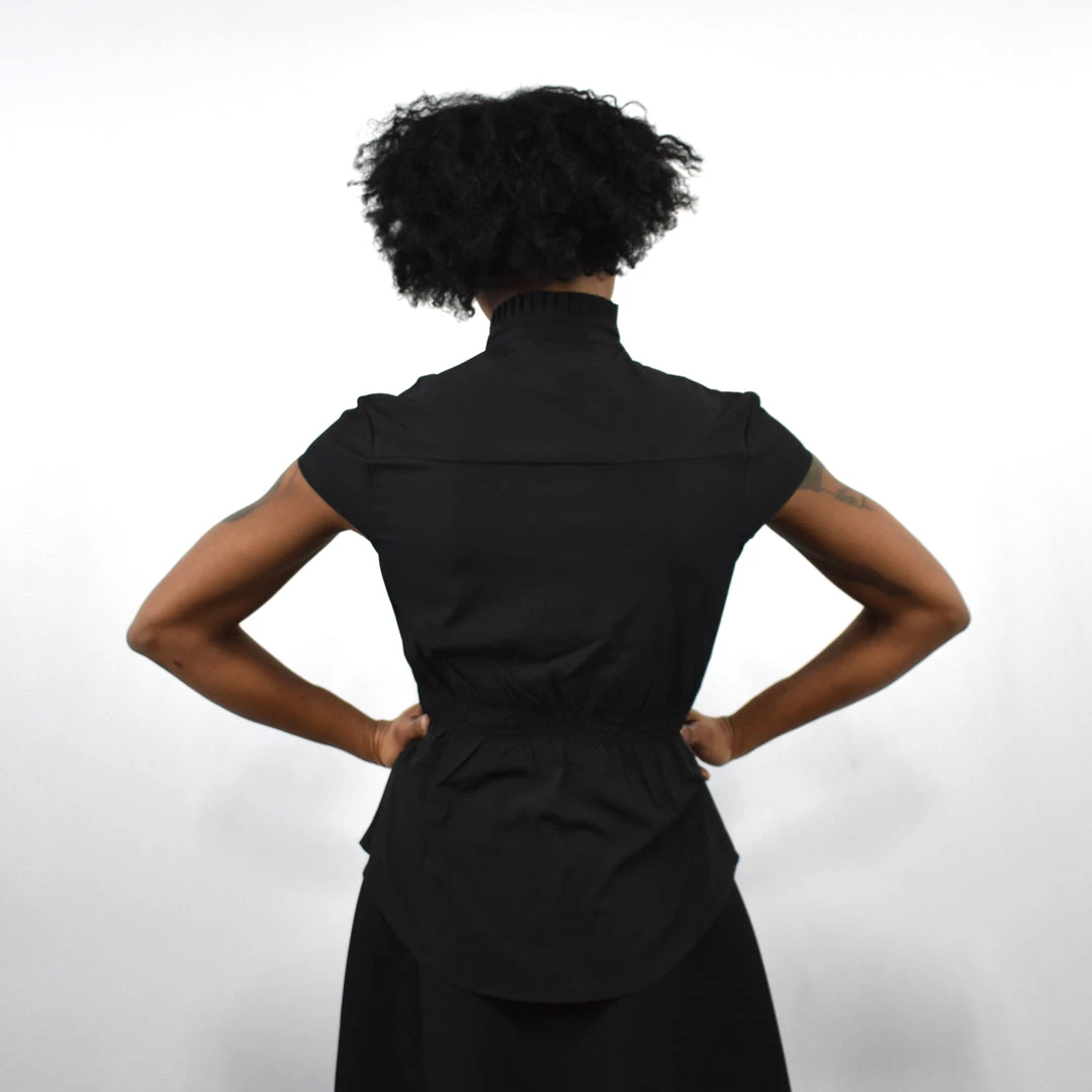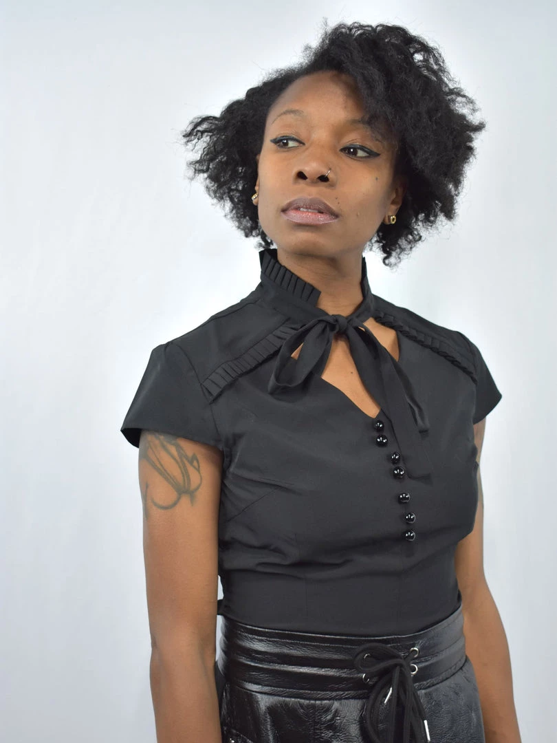The details on this top are just stunning! Pleated collar and shoulders, tie at neck, and faux buttons down the front. Gathered elastic waistband in back.