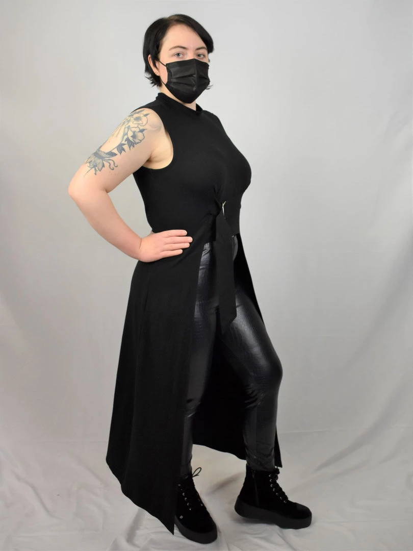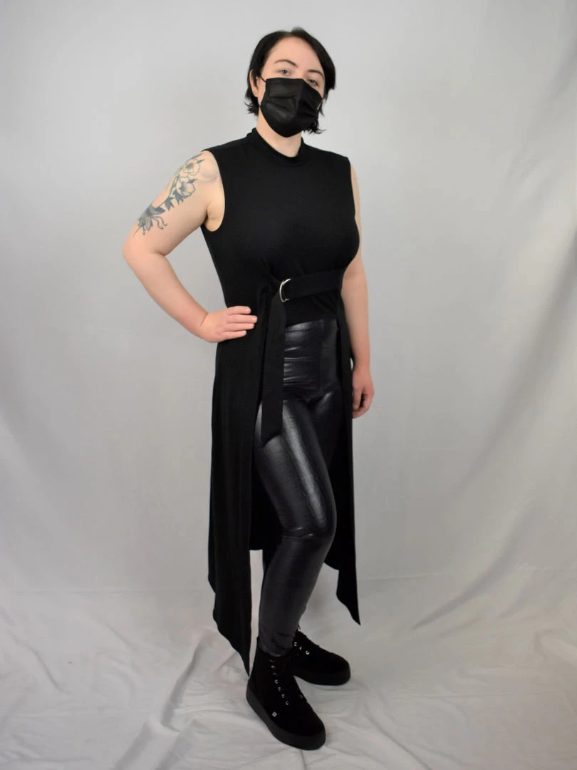 The dramatic D-ring tunic pairs equally well with pants, skirts or shorts, and cinches gently under the bust. An elegant mock turtleneck combined with an angular hem and open front makes this an elevated statement piece.