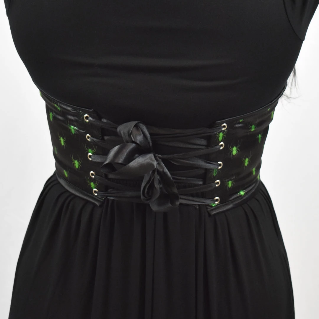 Weave a tantalizing web! Neon green spiders crawl across this underwire underbust cincher made of high quality satin fabric.