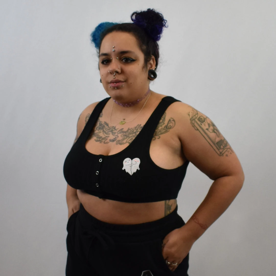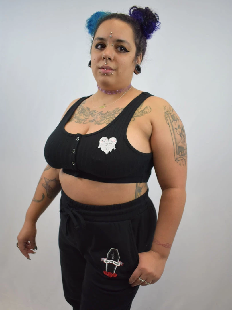 Turns out there IS rest for the wicked. Push that snooze button a few more times and dream on with comfort! This bra top is made out of super stretchy cotton spandex rib knit and features an original embroidered detail with a fake snap front for no peek-a-boo accidents. Elasticated waistband to holds everything down and is stretchy enough to be comfy enough to be worn all day, and night, and the next day after that. No underwire, no hardware, no problem.