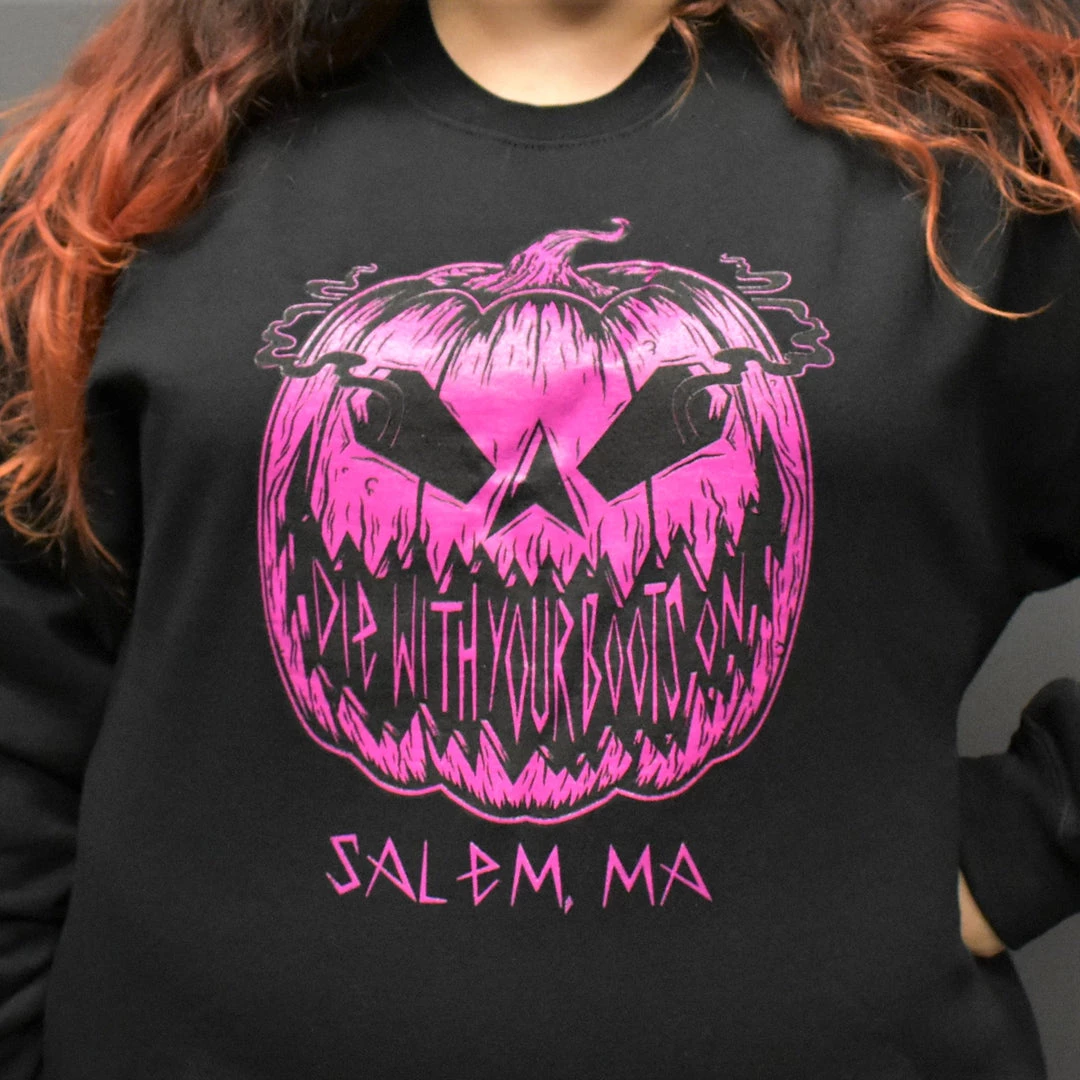 Wear our extra creepy jack o’lantern to celebrate your favorite season year round! A DWYBO exclusive design by our own Tiffany of Bats in the Belfry Crafts printed in our signature magenta on a black unisex sweatshirt.