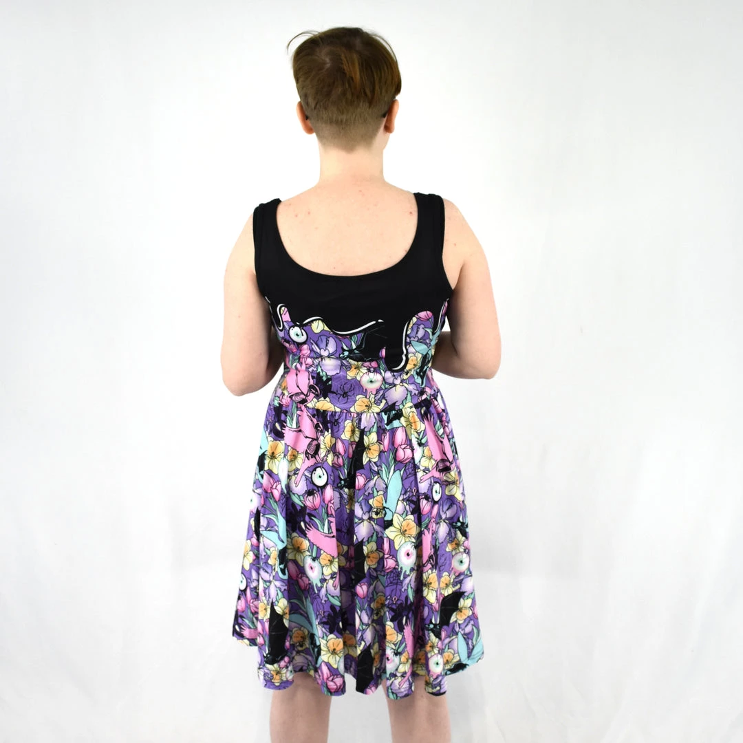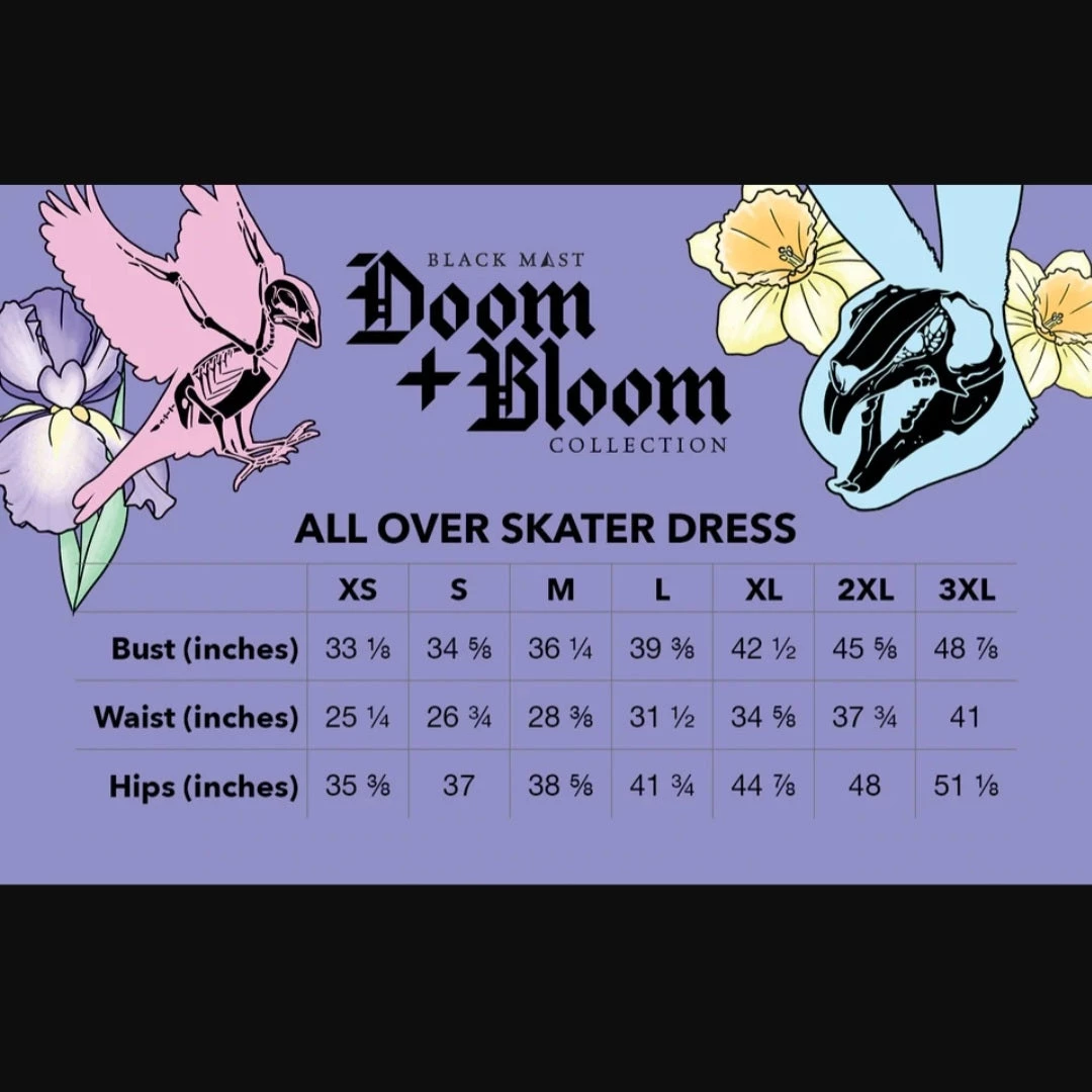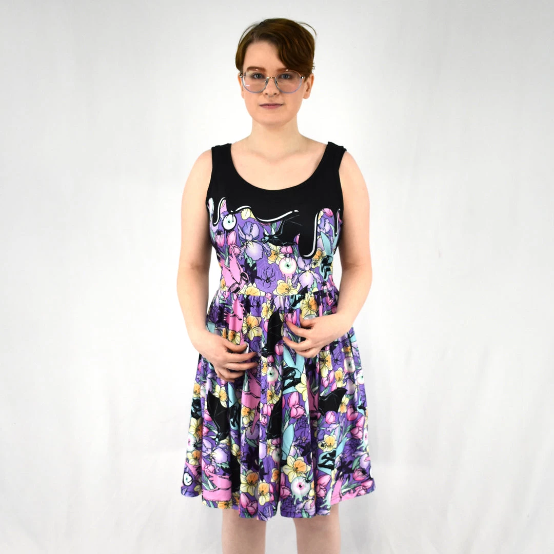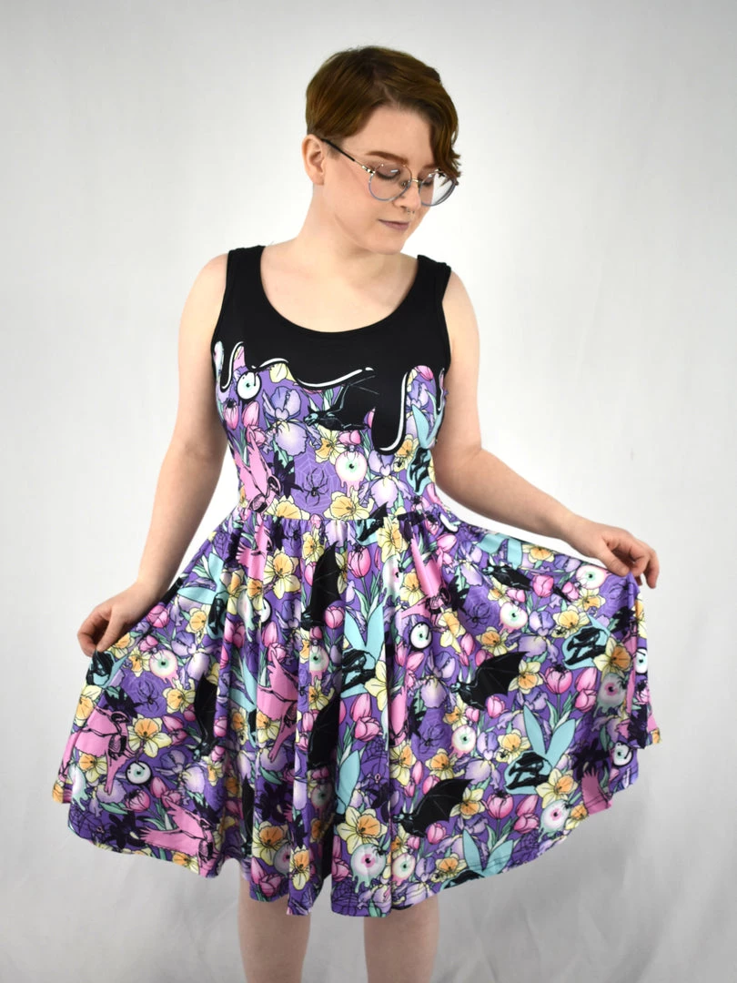 Get a little spooky for spring! The Doom + Bloom all over pattern dress by Black Mast is a creepy cute pastel goth design featuring pops of black blooming between cotton candy colors. Pastel spiders, animal skeletons, and slimy eyeballs creep among springtime flowers. Perfect to pair with your black or pastel moto jackets!