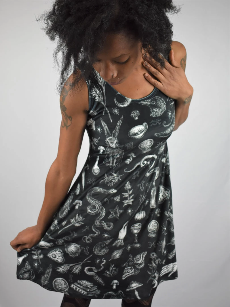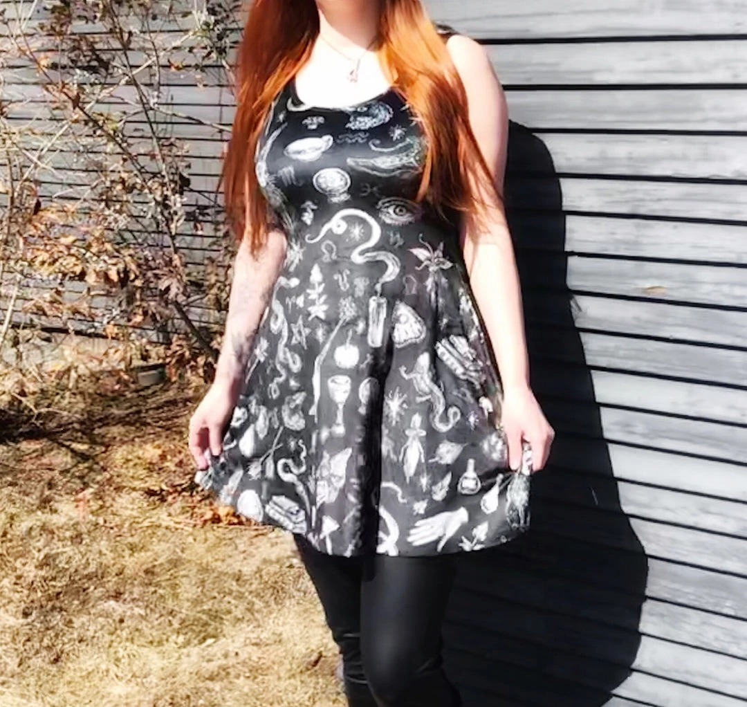 Bubble, bubble, toil and trouble! This Witchy Musings dress, featuring art by the magical Brett Manning, is one of our favorite things! This flattering skater dress is made from an exceptionally soft, velvety velour material that you’ll want to live in. It’s stretchy, and comes in sizes XS-5X! For sizing details, see the sizing chart in the photos. It’s an excellent piece for layering, but looks great on its own, so you can wear it while it’s cold and straight on through warmer weather. This dress is also an exclusive to Die With Your Boots On!Â