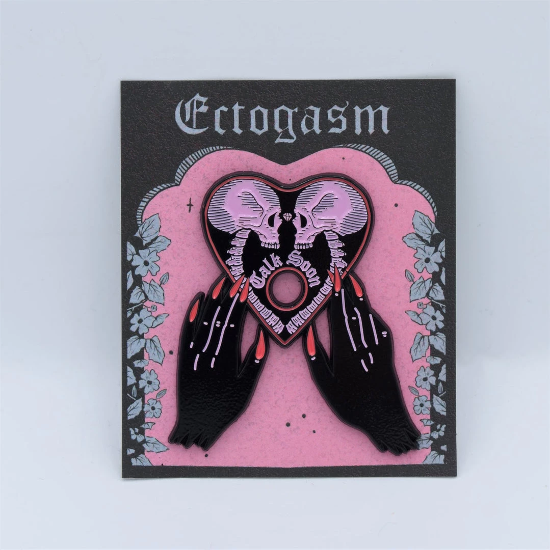 This wicked enamel pin features a pair of witchy hands on a planchette. The planchette has a pair of pink skulls on it with the spooky quote, “Talk Soon”.