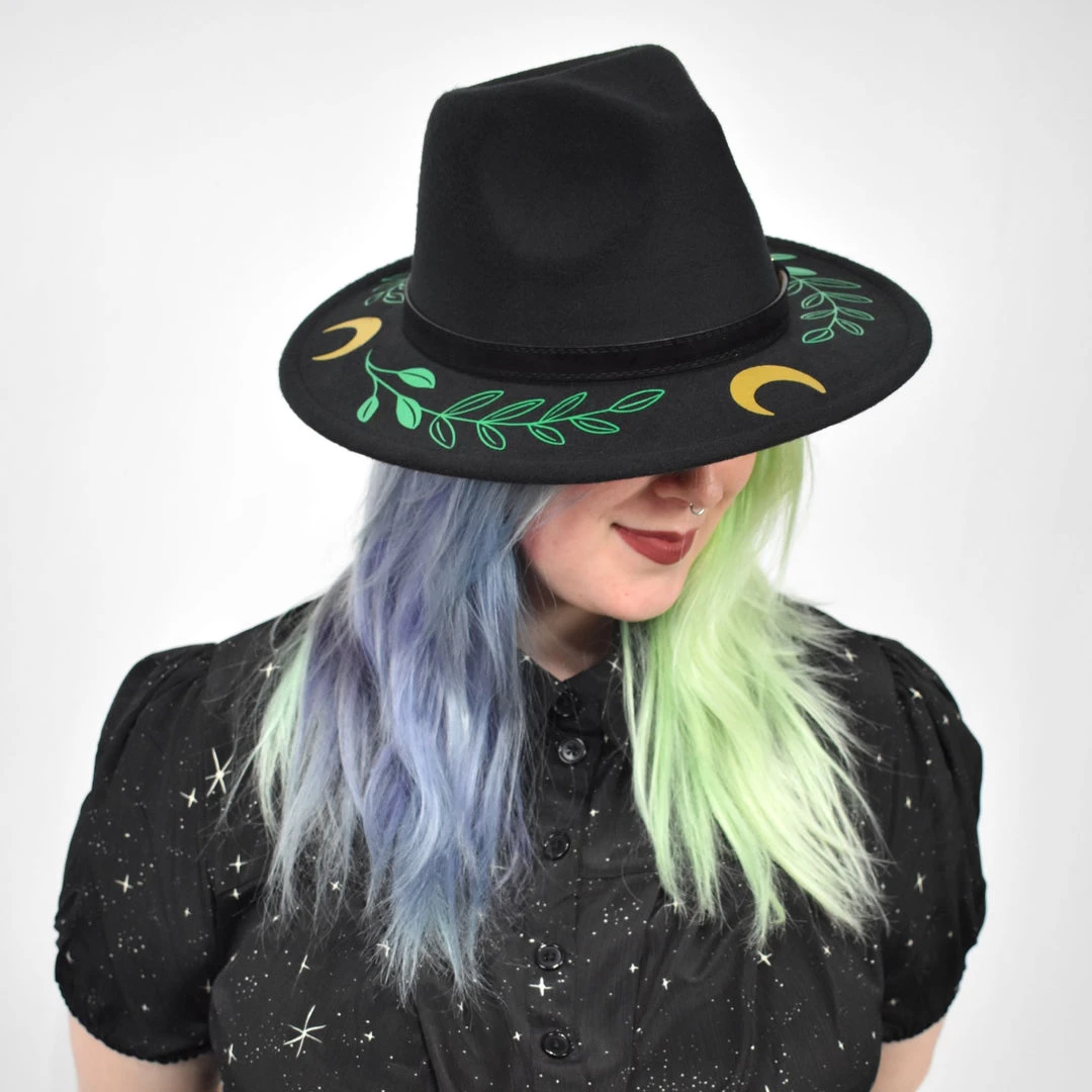 This wide brim hat is made of sturdy vegan felt and is hand printed by Witchwood in a green and gold fern moon design on the outer brim.