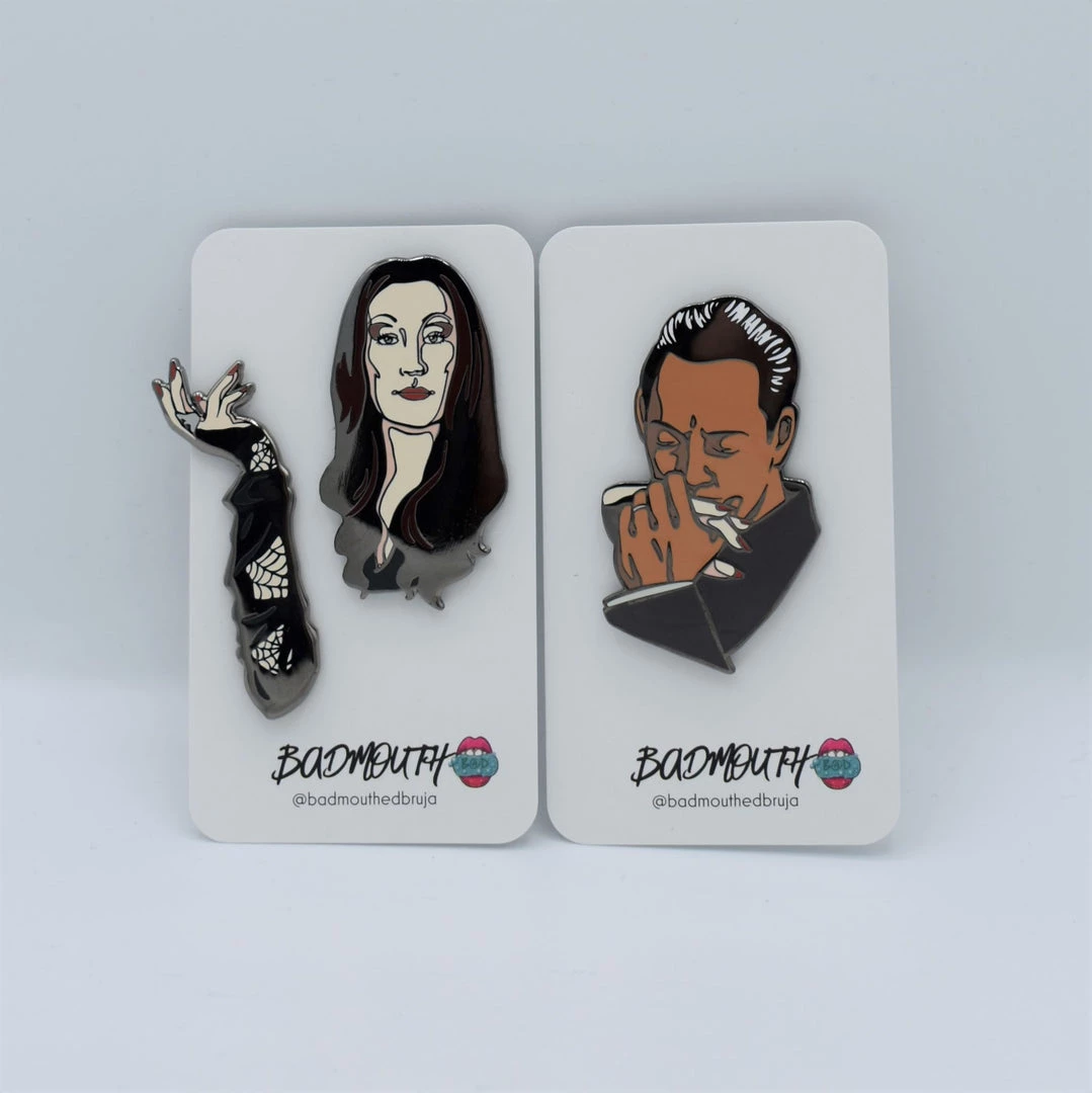 Say Hello to this gorgeous hard enamel pins of our favorite creepy couple Morticia & Gomez Addams. Three pin set: two 2″ head pins and a 2″ hand pin (Hard Enamel, Black Plating, Double posted on both head pins, Double posted hand pin)