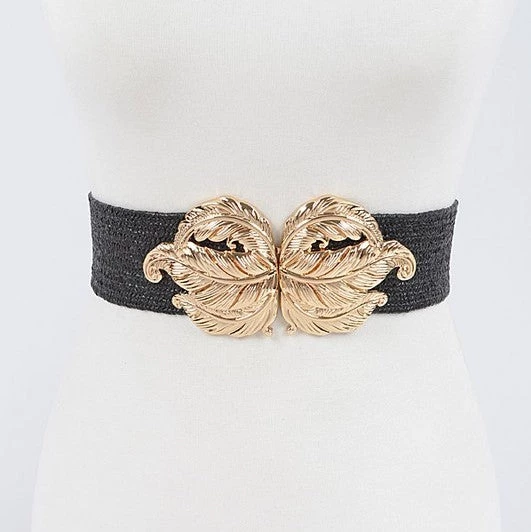 Golden leaf metal buckle on a stretch straw belt. Has front buckle clasp closure. Approximately 2.25″ wide and 28.75″ long.Â