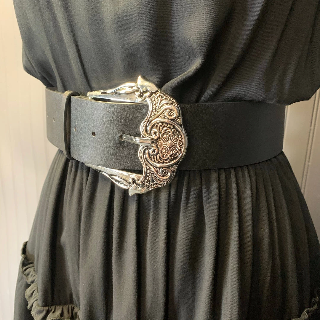 This wide vegan belt features a huge shiny silver belt buckle with a filigree design. It is adjustable to fit a range of sizes.Â