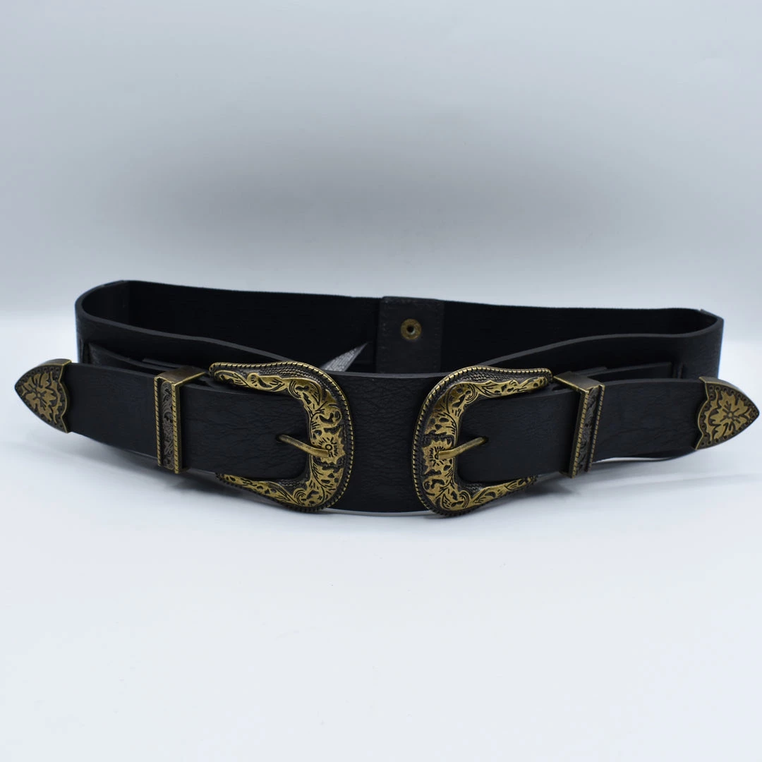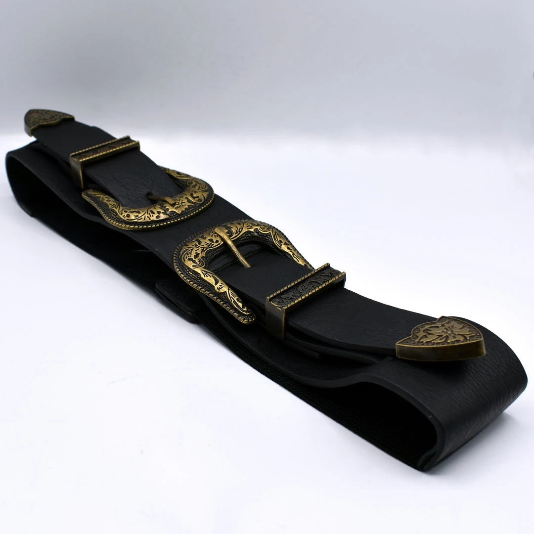 The double buckle belt is one of our favorites at the moment! We’re seeing them everywhere and this one in particular is pretty awesome. Thick width, vegan material, faux leather in the front, stretchy in the back with a two-snap closure, this is sure to fast become a favorite of yours as well! Buckles are western style with an antique gold hue to them.