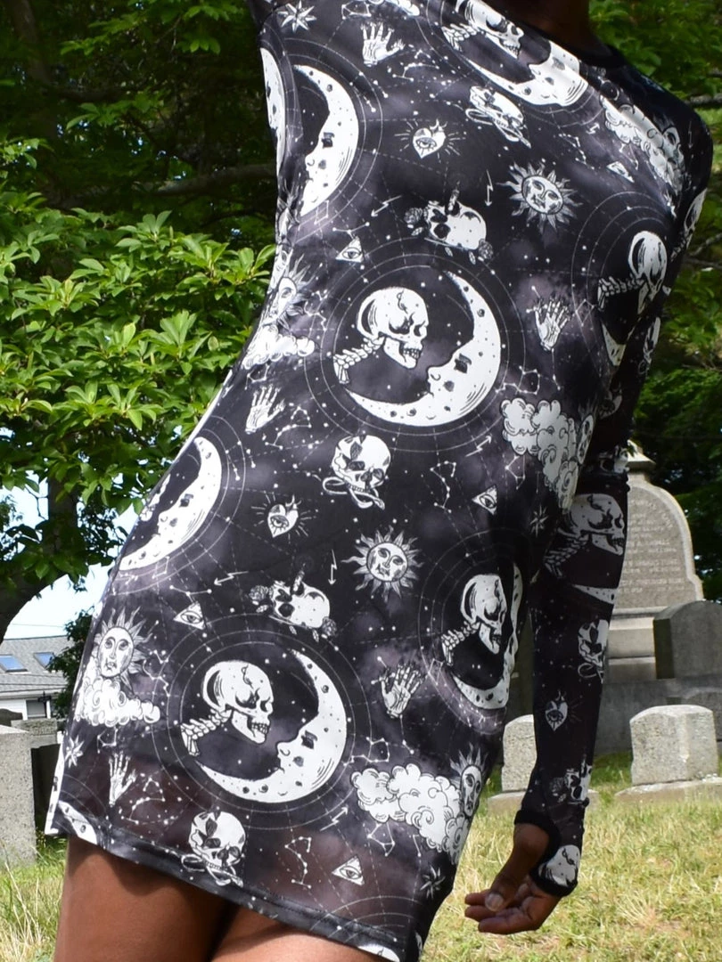 Our alternative style is reaching astronomical heights in the Celestial Mini Dress. Featuring a gorgeously gothic and dreamy print on a see-through mesh, with black lining and long sleeves with thumbholes.