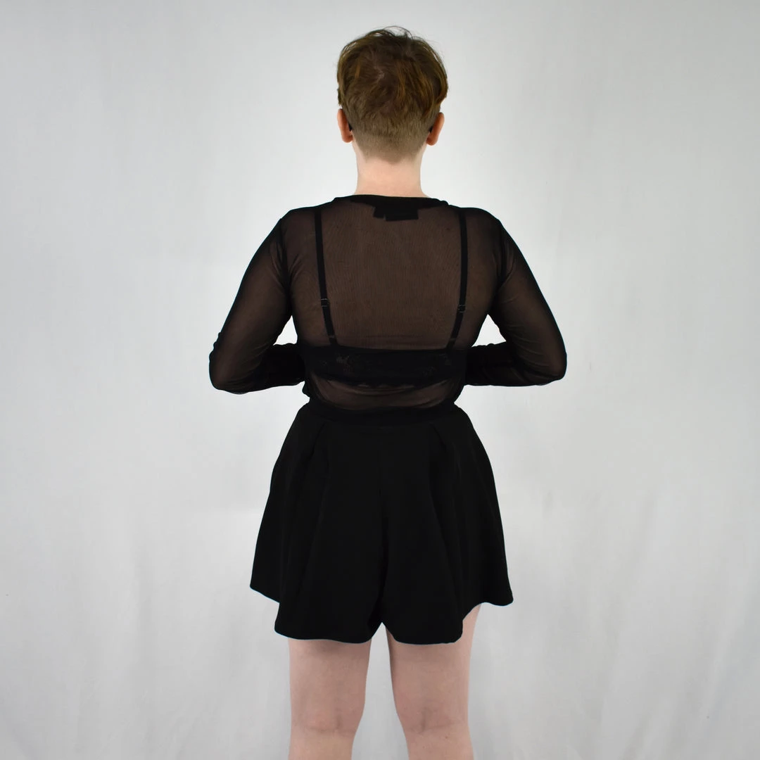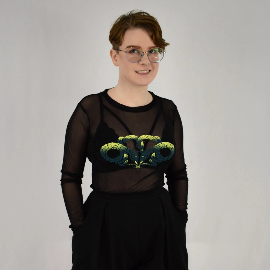 Black long sleeve mesh top screenprinted with two entwined snakes in lime green and teal. Perfect for layering.