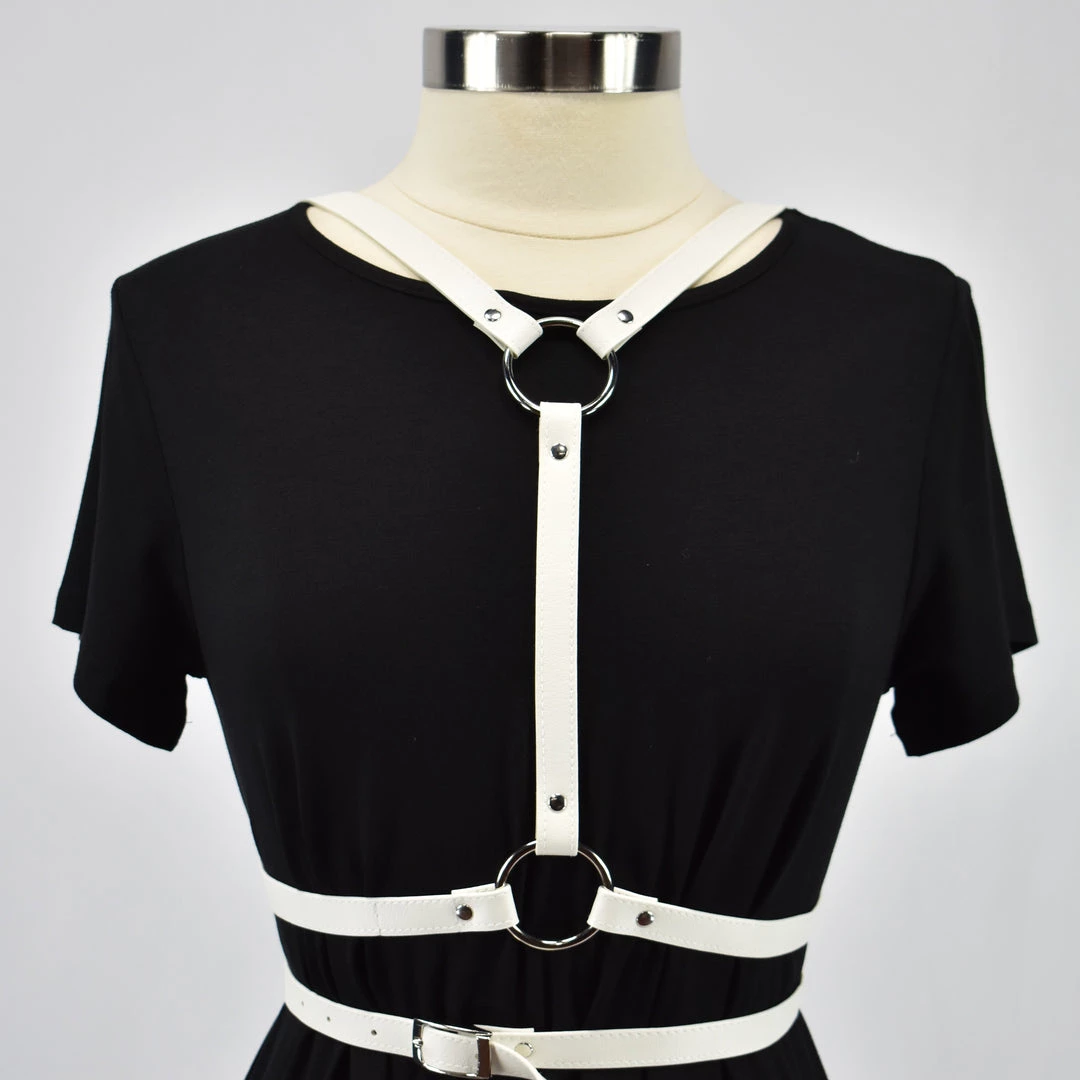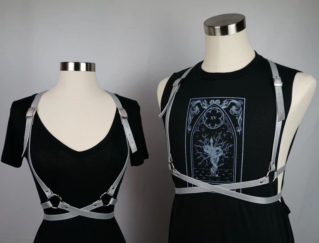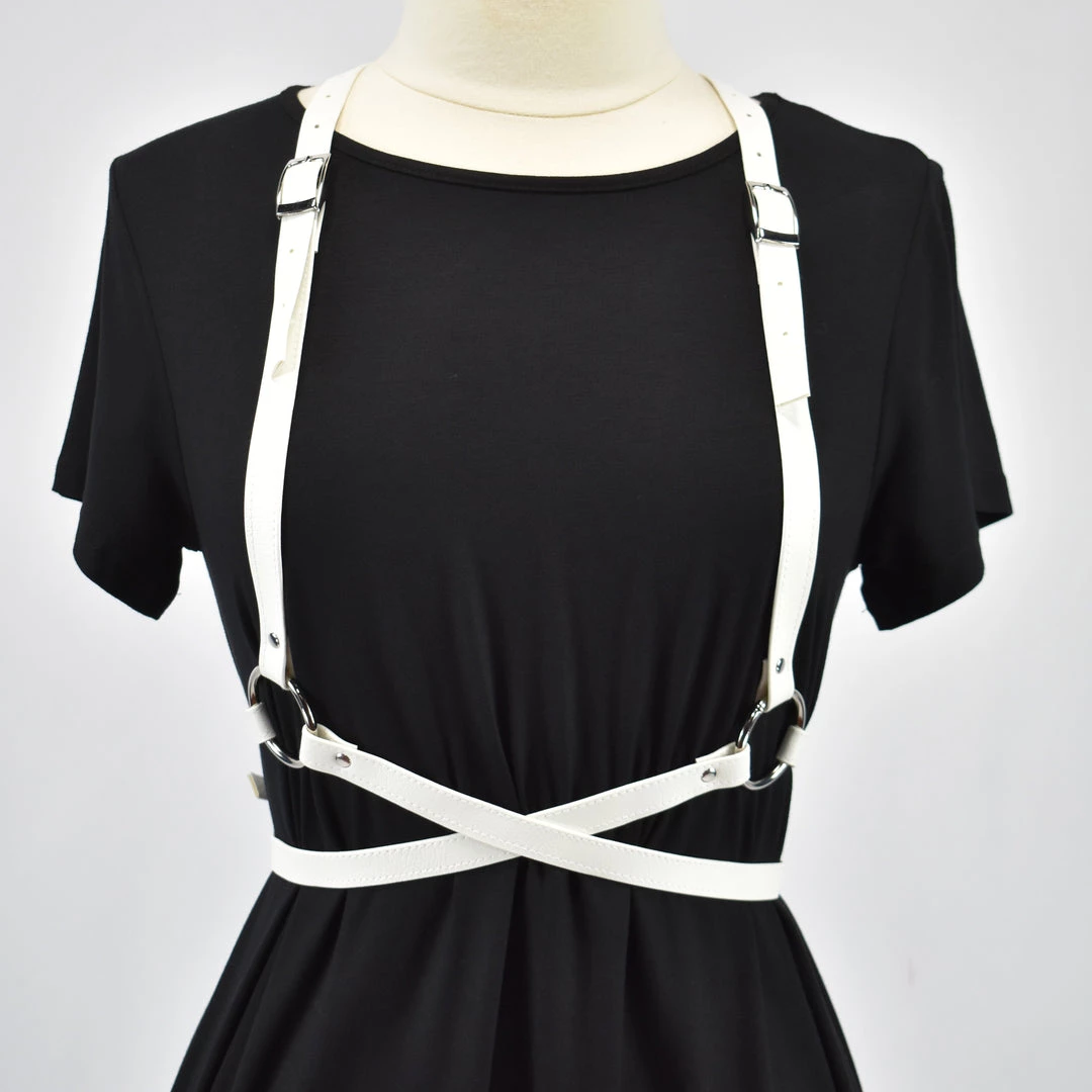 Adjusts at the shoulders and waist. Designed so that excess harness material may be trimmed off without fraying! Looks great layered, so you can wear one backward and one forward at the SAME TIME!