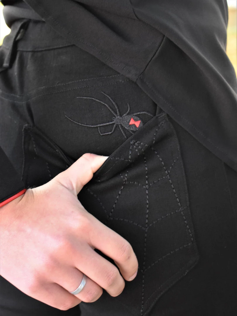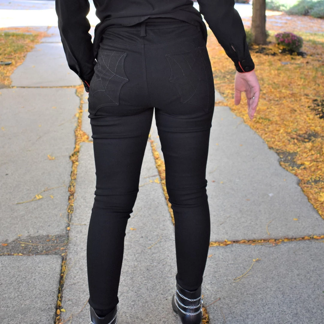 The jeans have an ultra-high waist and a stretchy fit, featuring spiderweb stitching on the web shaped back pockets and an embroidered black widow hidden underneath.