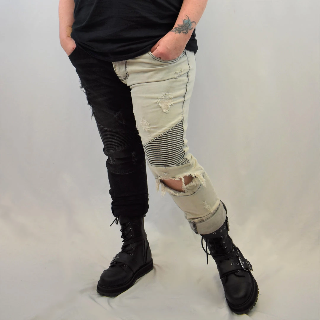 These distressed black and white contrast skinny jeans have rib quilt stitching detail above knee, five pockets, and button closure on a zippered fly.
