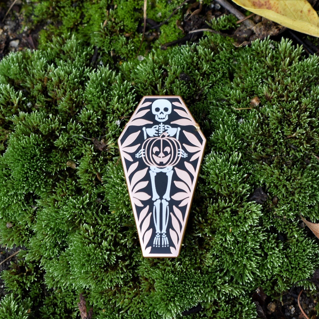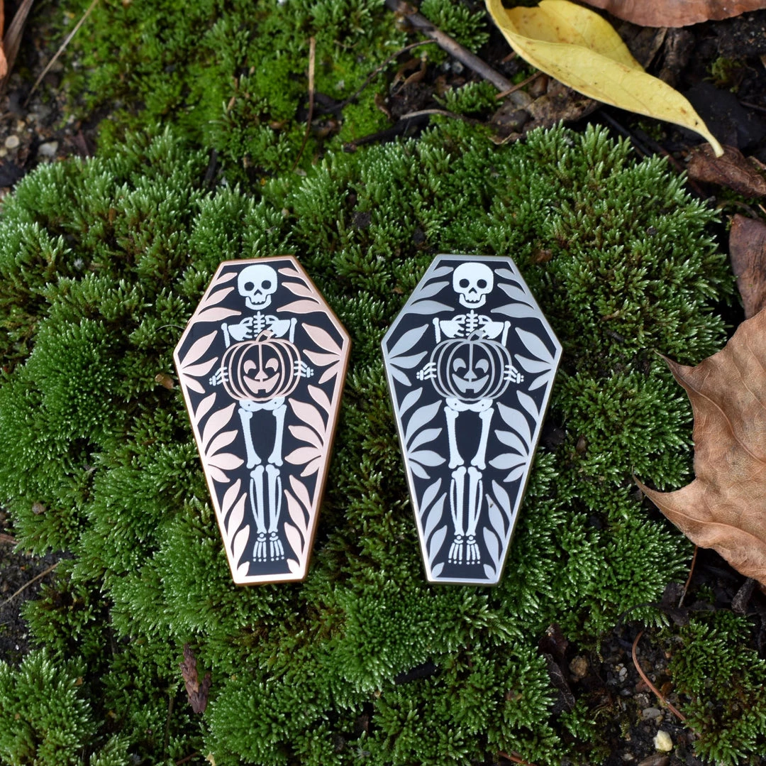 This coffin-shaped pin by Laserbrain Patch Co. depicts a grinning skeleton with his favorite jack o’lantern in black hard enamel with white screenprinted detail over a rose gold or silver metal base. It measures about 1″ x 2″ and has two pin prongs with rubber backs.