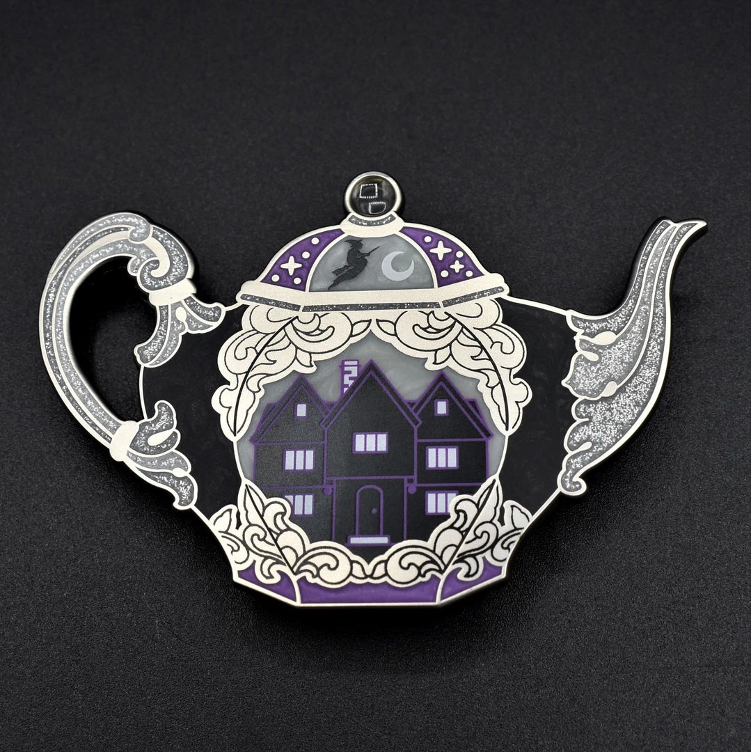 This giant, stunning pin by Laserbrain Patch Co/Lapels & Spells features our beloved Witch House on a teapot embellished with a silver glitter handle and spout, swirled black and white enamel, witch and moon, and a clear glass knob on the lid. Measures approximately 2″ tall x 3″ wide.