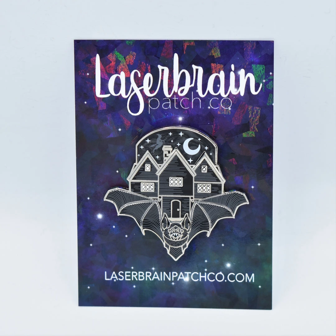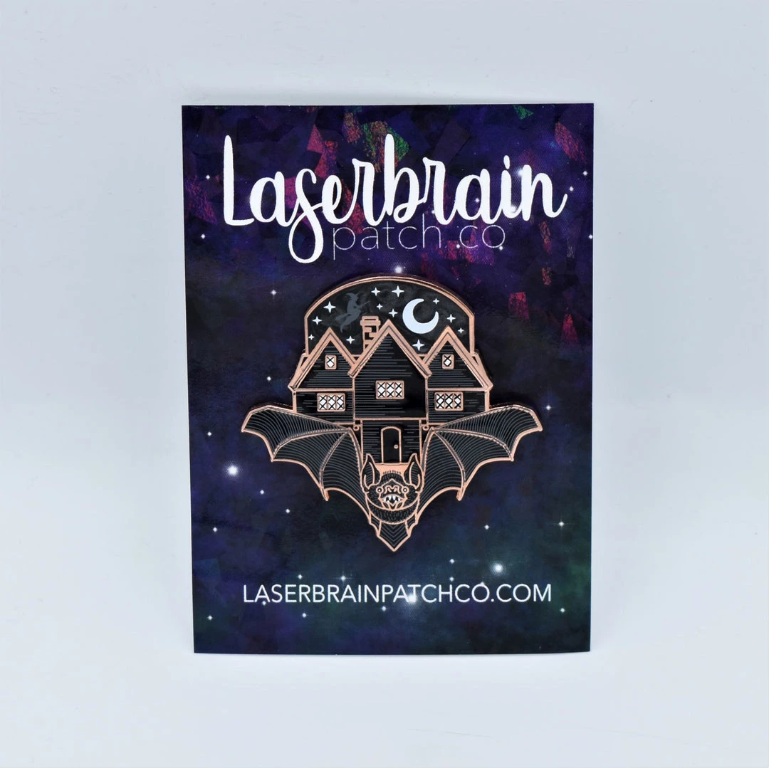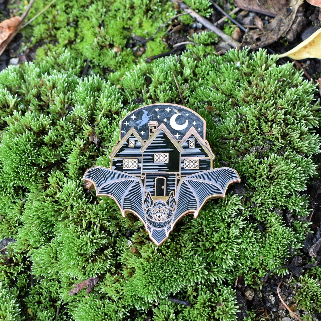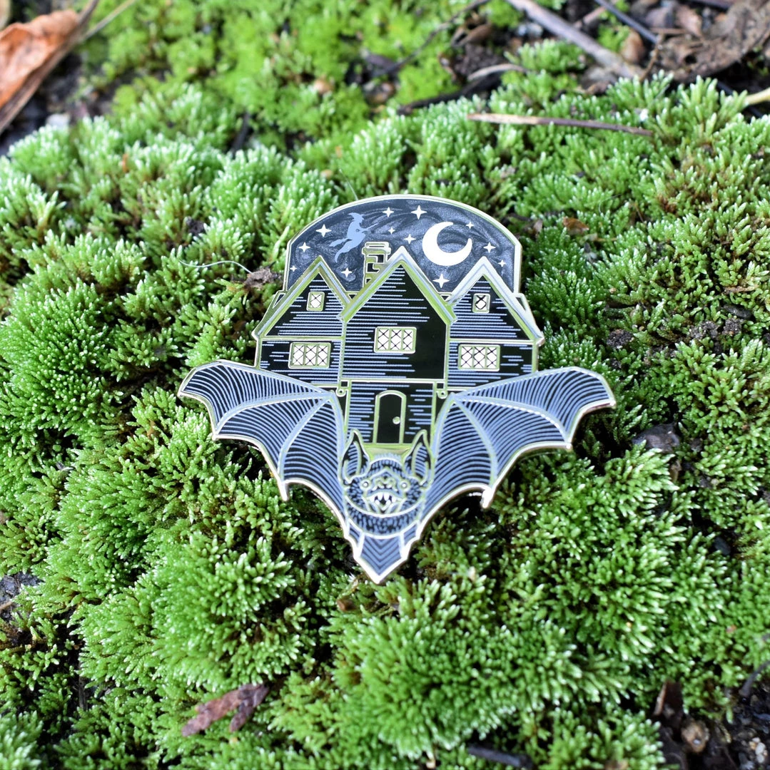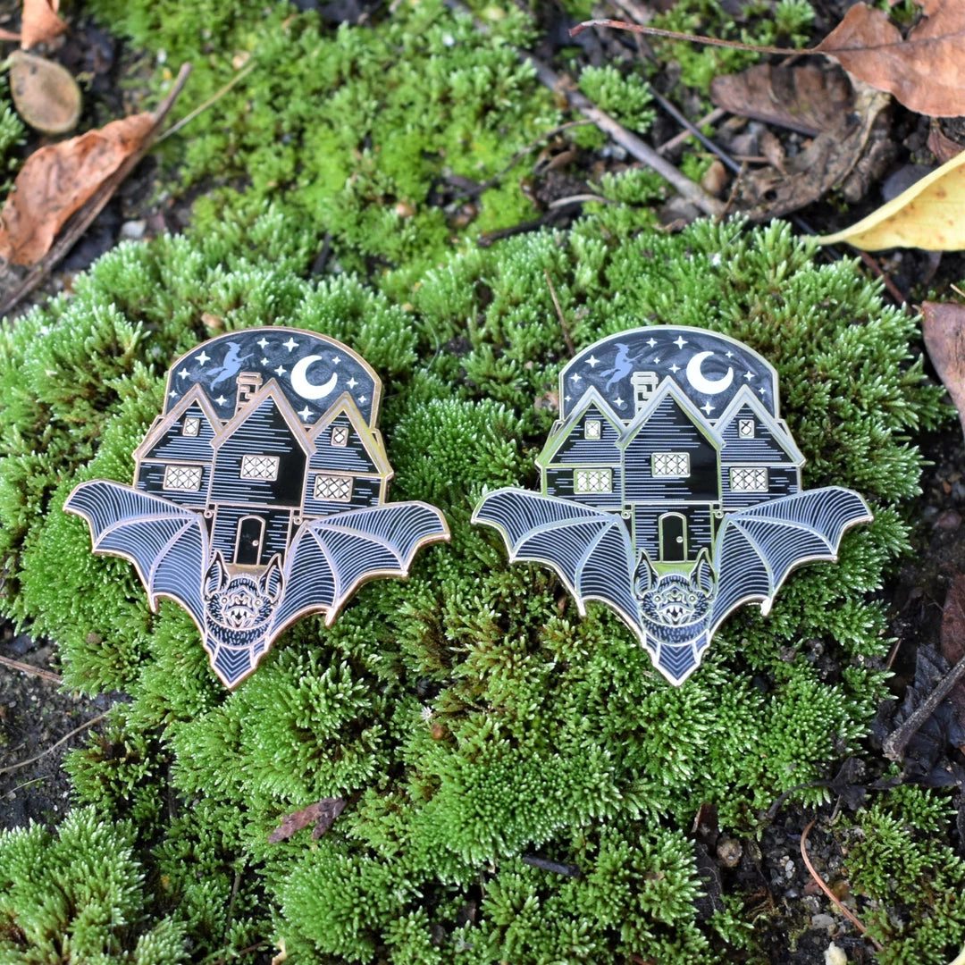 Measures approximately 1.75″ x 1.75″. Rose gold or silver metal pin with black and white enamel, swirled black and gray enamel sky, and screenprinted details. Two pin posts with rubber backs.