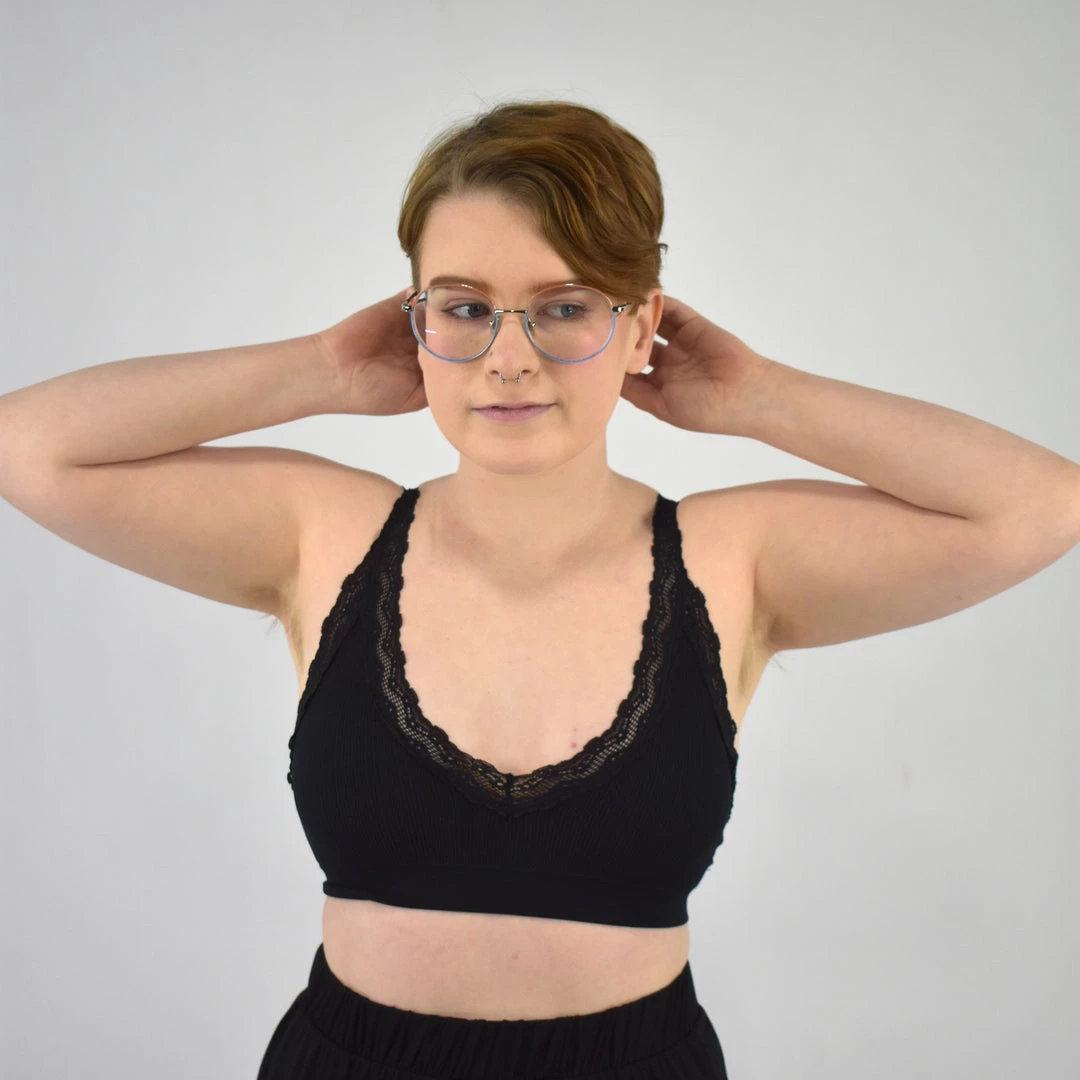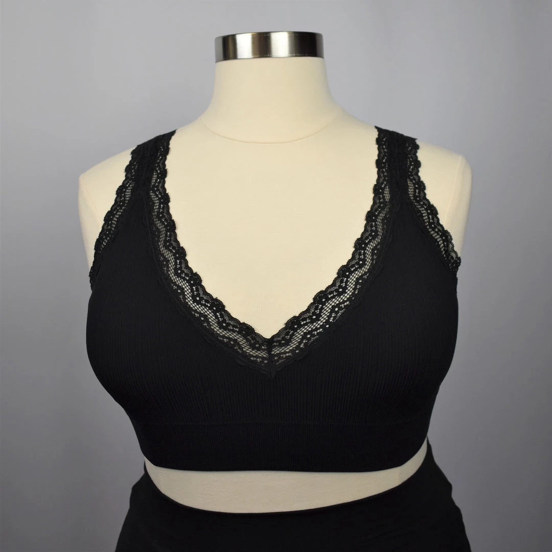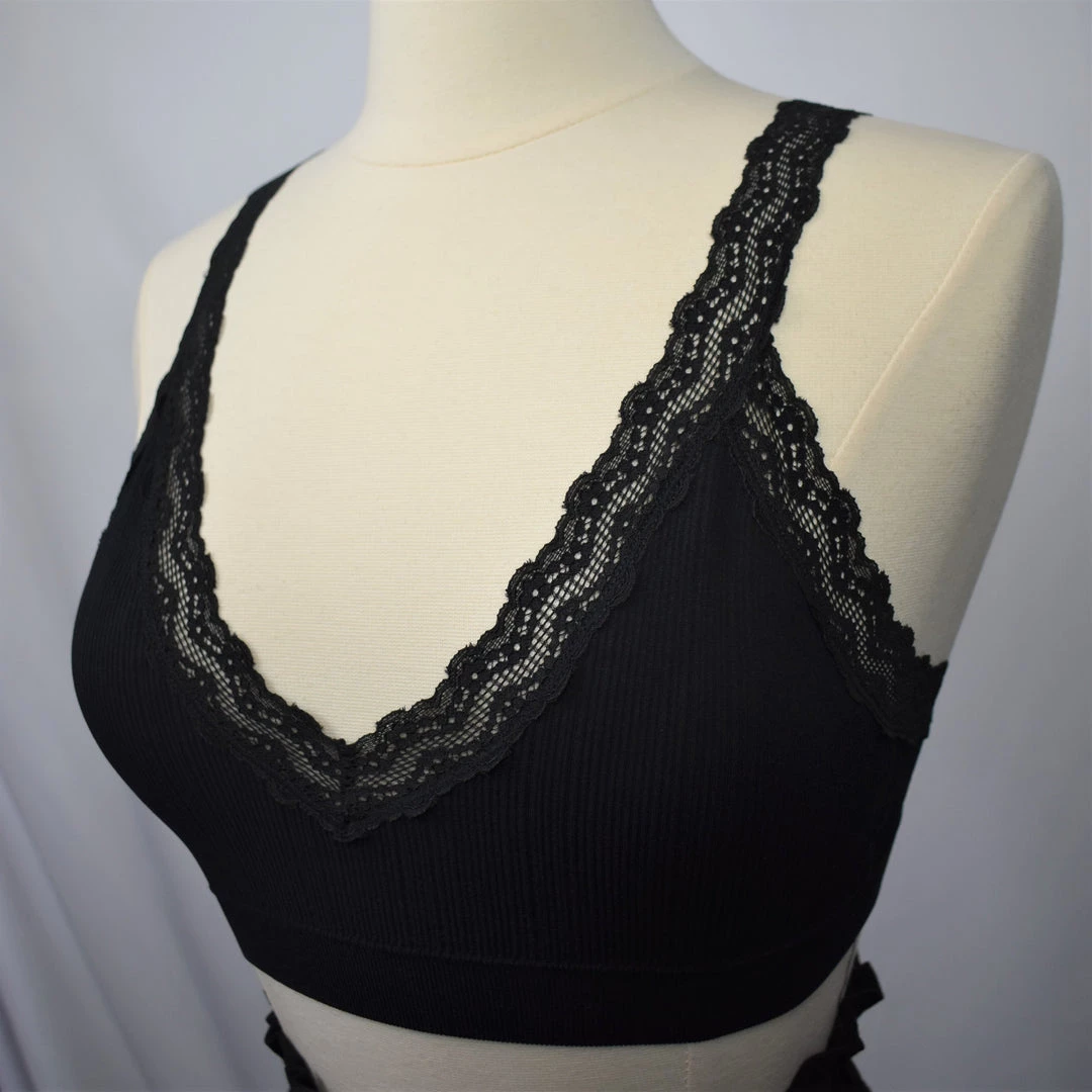 This v-neck bralette features super comfortable ribbed knit material with lightly padded cups and lace trim. 92% nylon, 8% spandex.