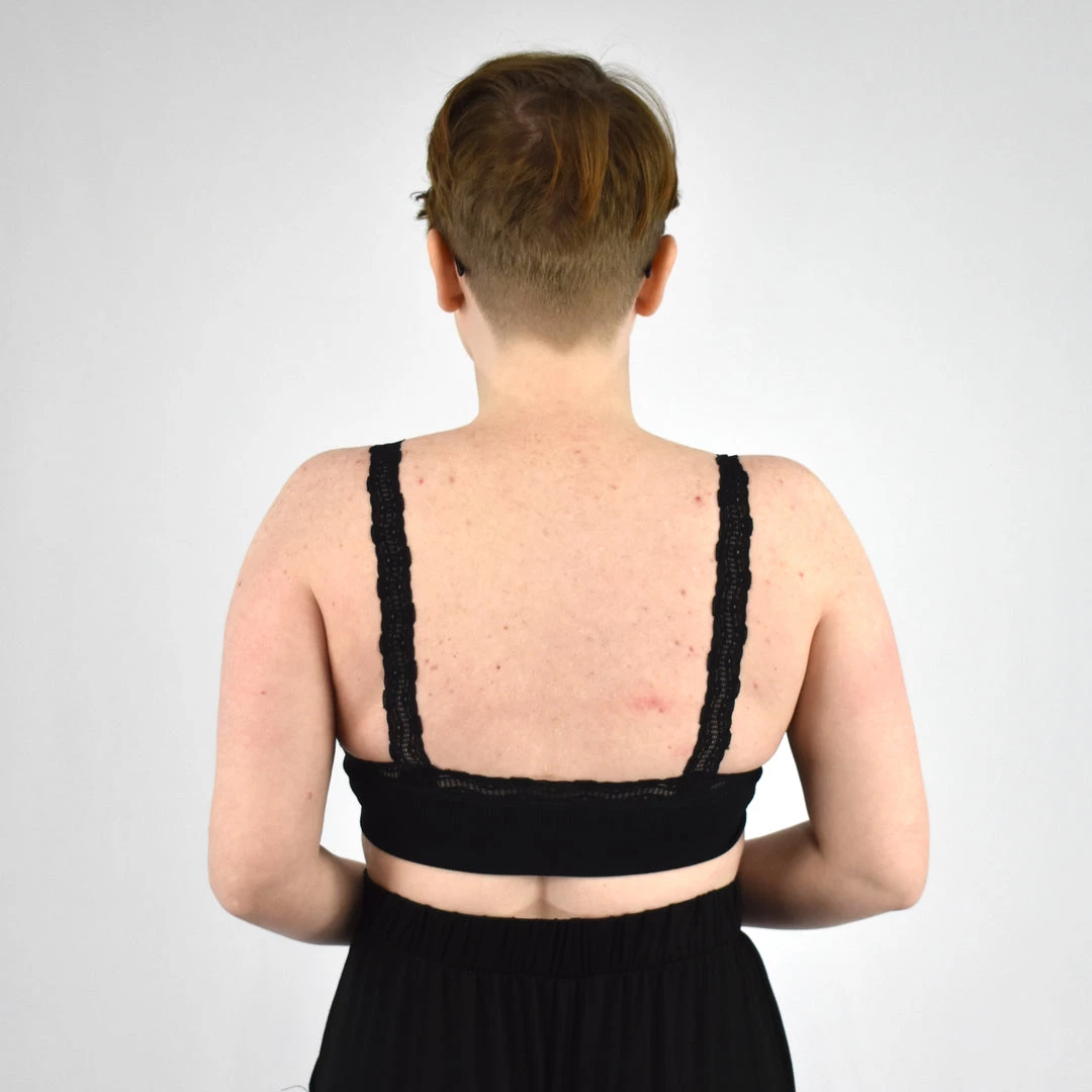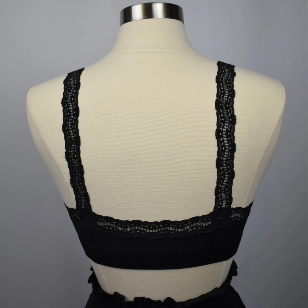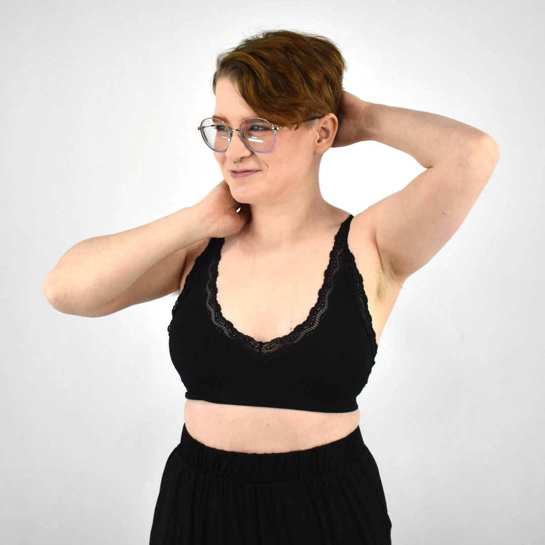 This v-neck bralette features super comfortable ribbed knit material with lightly padded cups and lace trim. 92% nylon, 8% spandex.