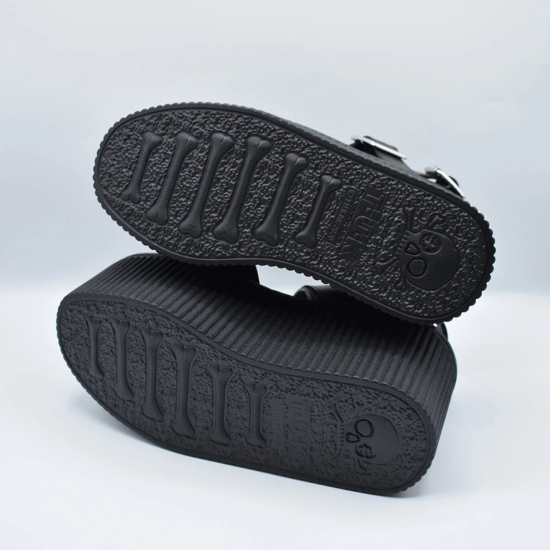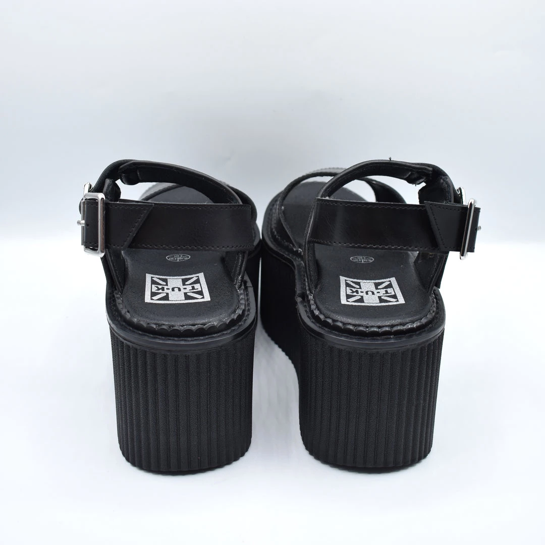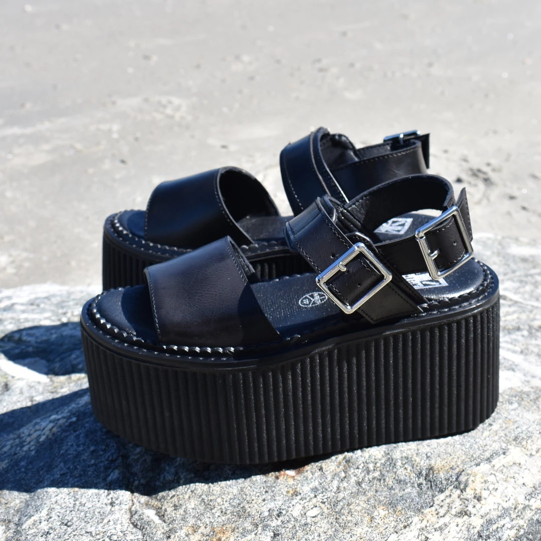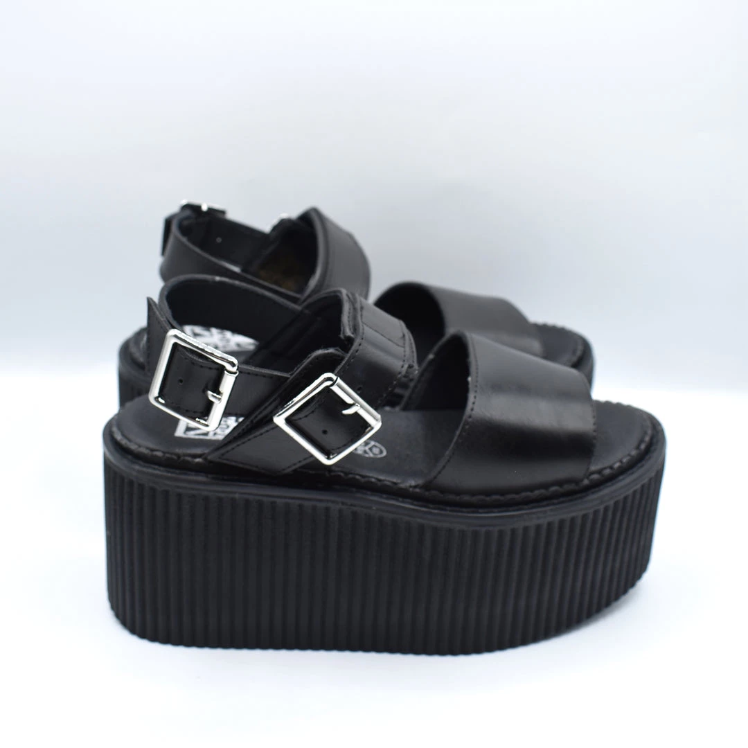 The higher the platform, the better. These throwback strappy sandals feature a brush-off PU upper on a lightweight VIVA stratocreeper sole that has a platform height approximately 3” at the heel and 2.5” in the front.