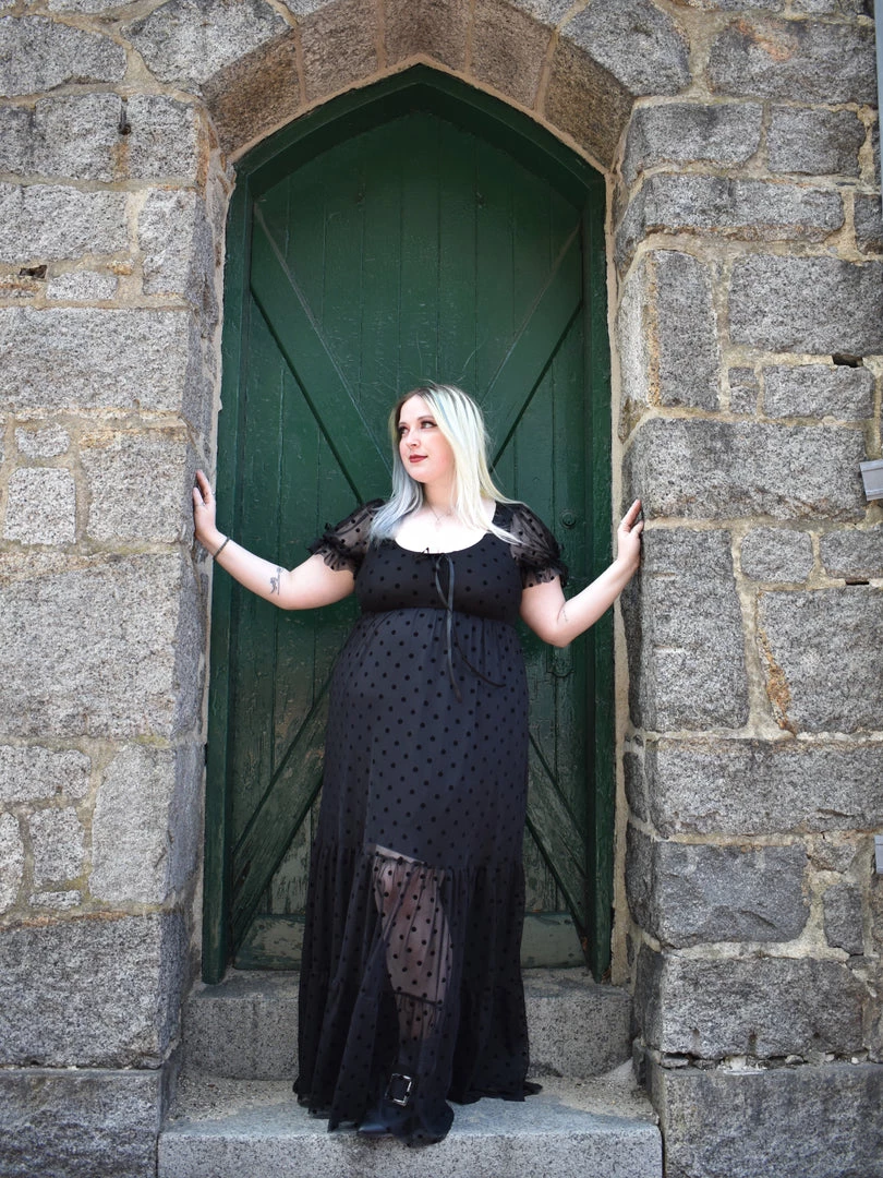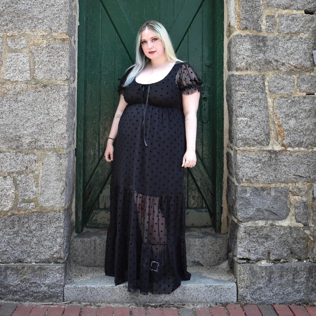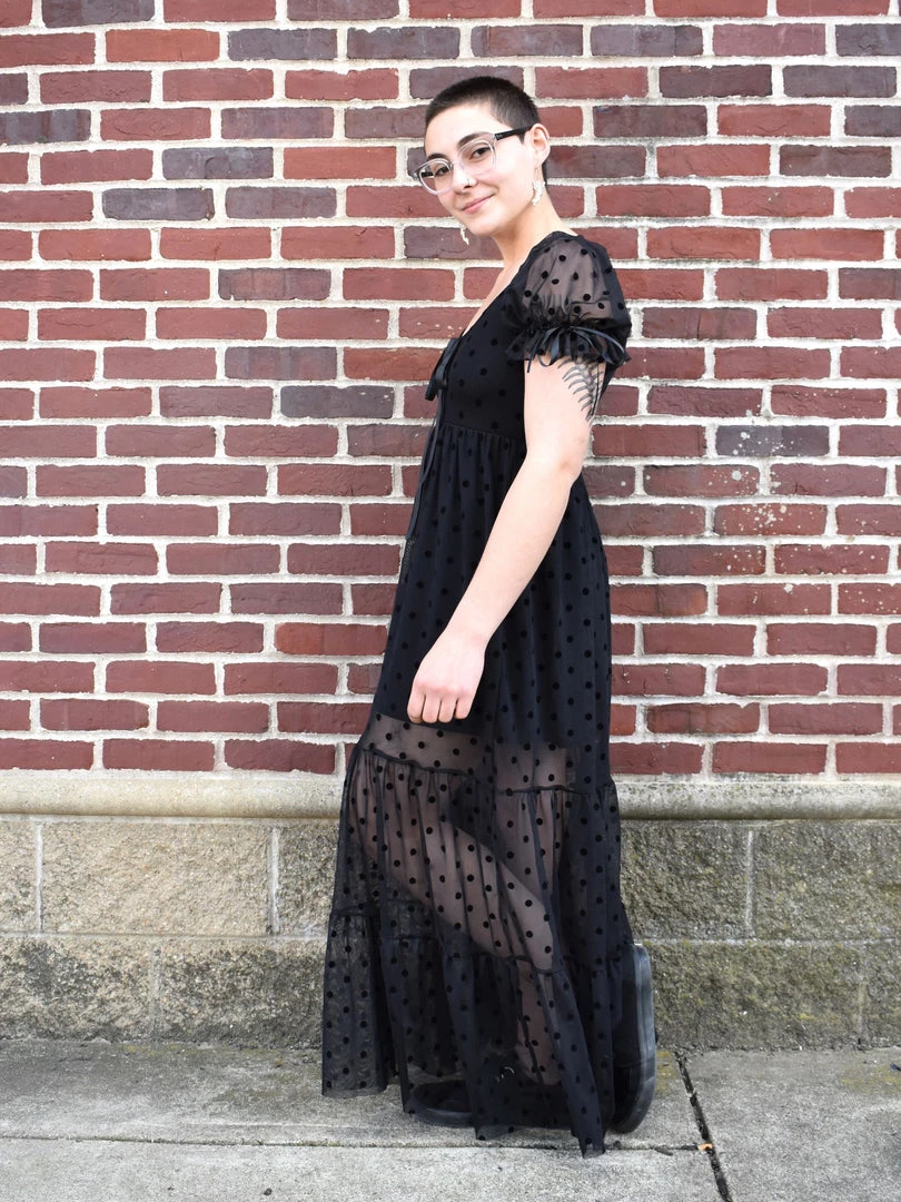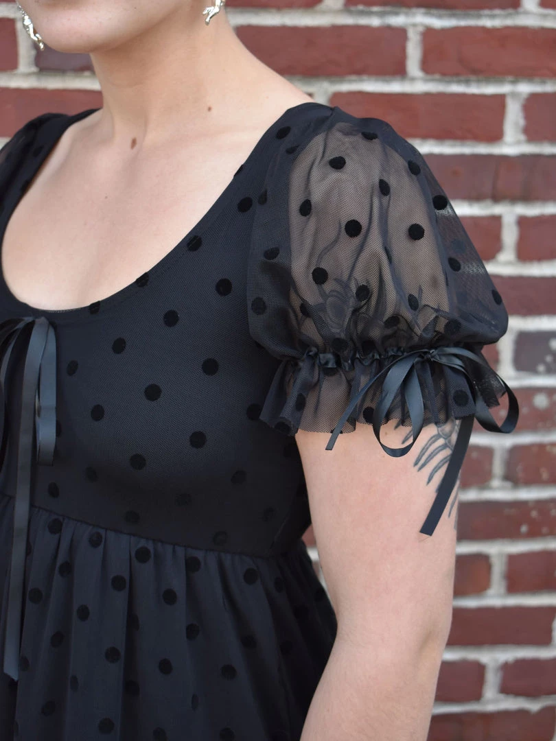 This flowing dress has black satin bow details at the center bust and outer arms cuffs.