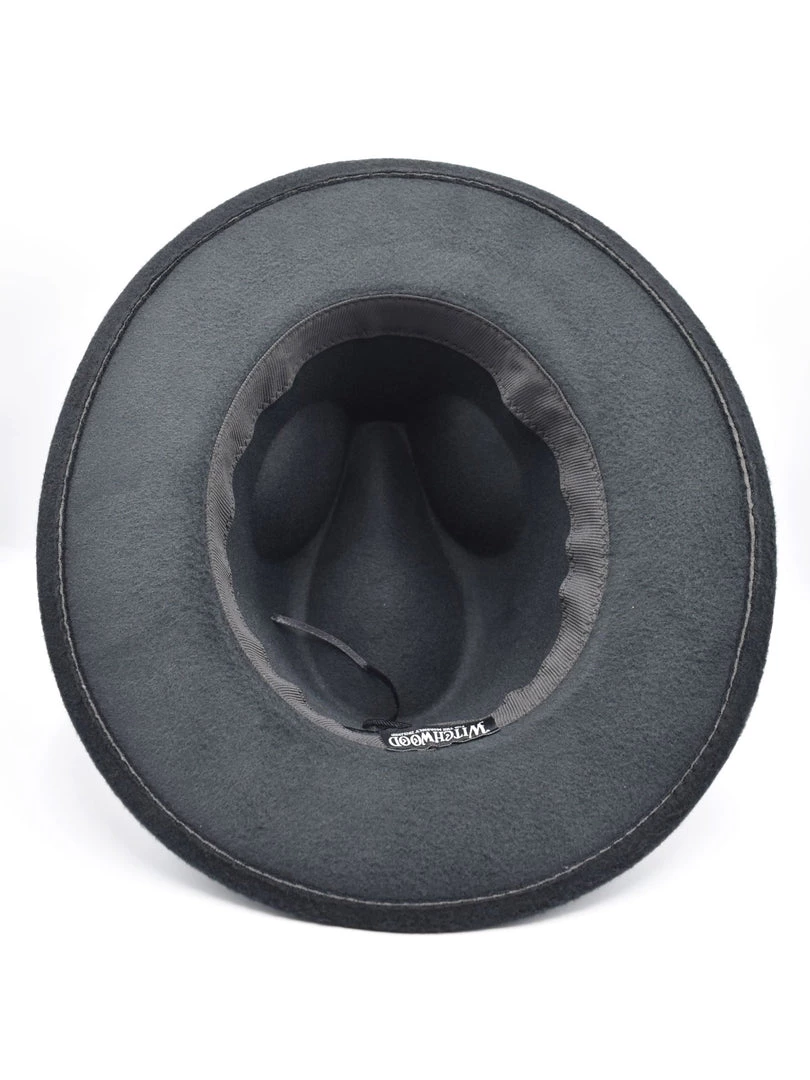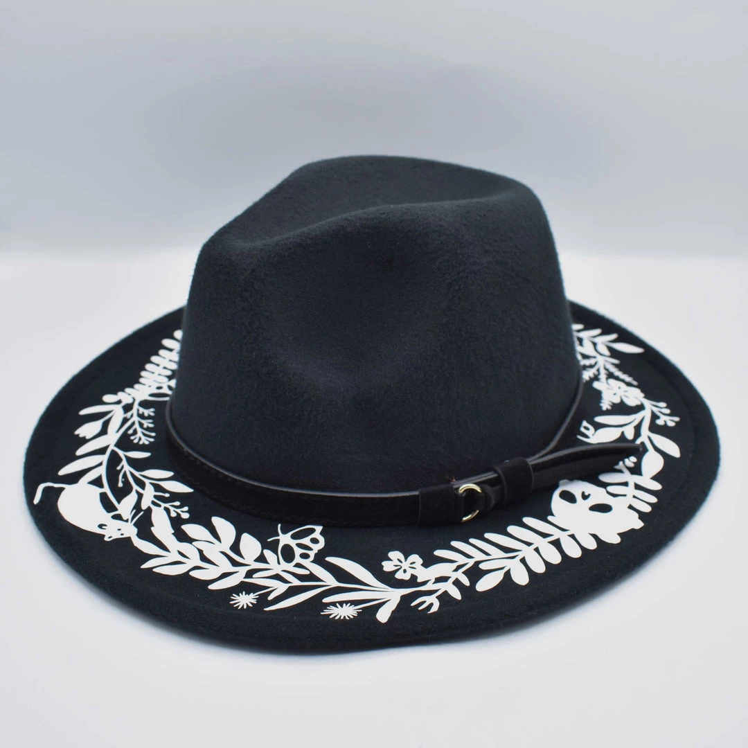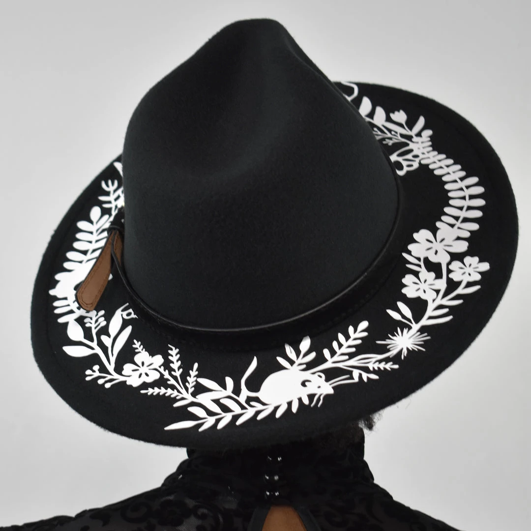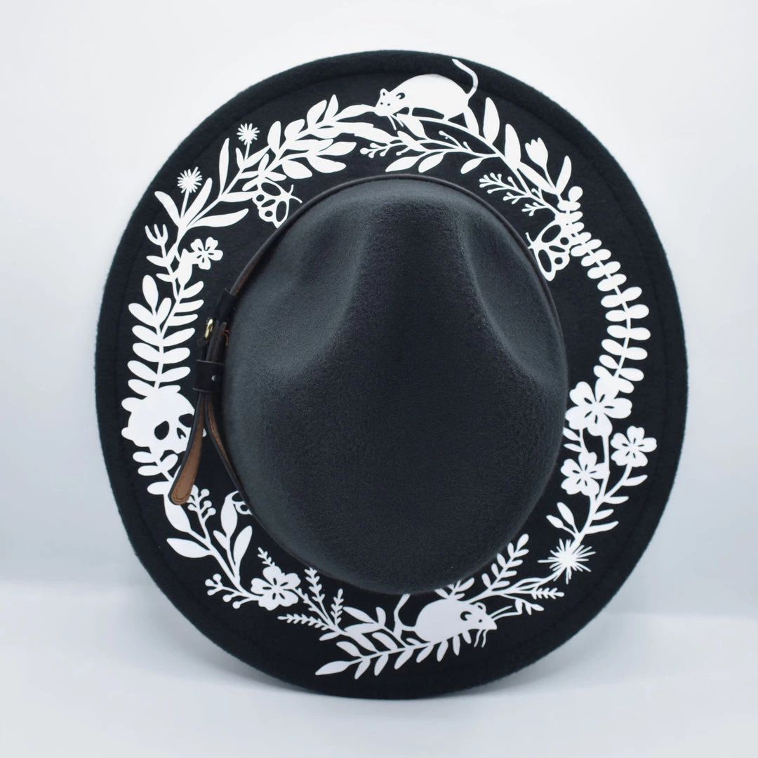 This wide brim hat is made of sturdy vegan felt and is hand printed by Witchwood in a white floral design on the outer brim.