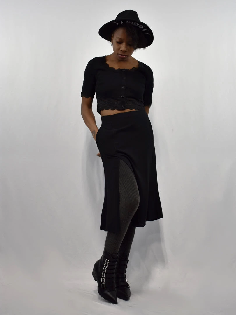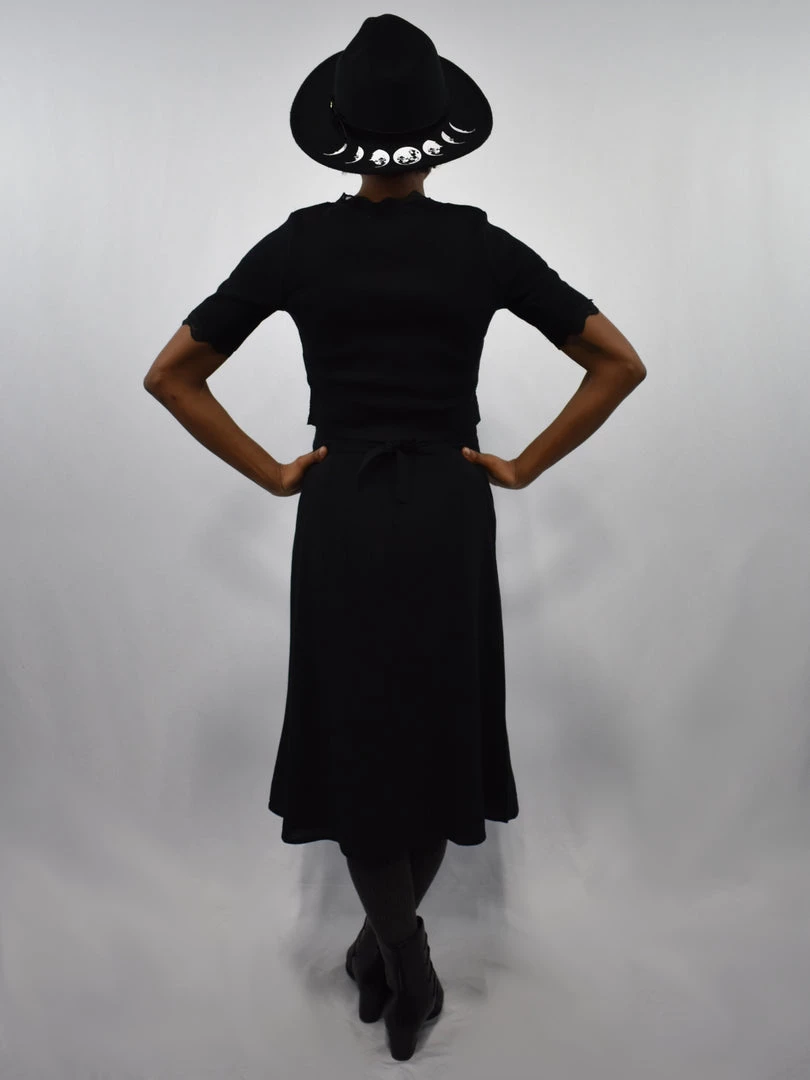 The perfect midi skirt is here! A slit to show just the right amount of leg, 2 pockets for snacks, and small ties at the back waist for the perfect fit.