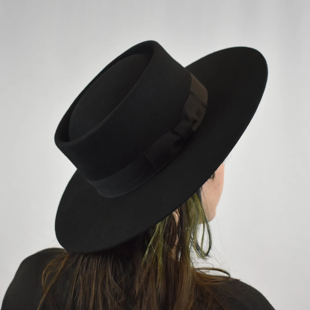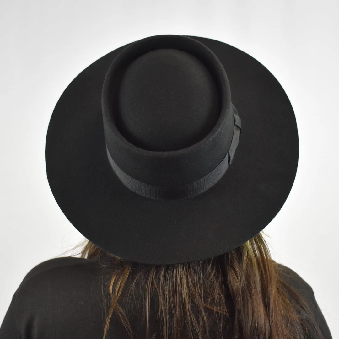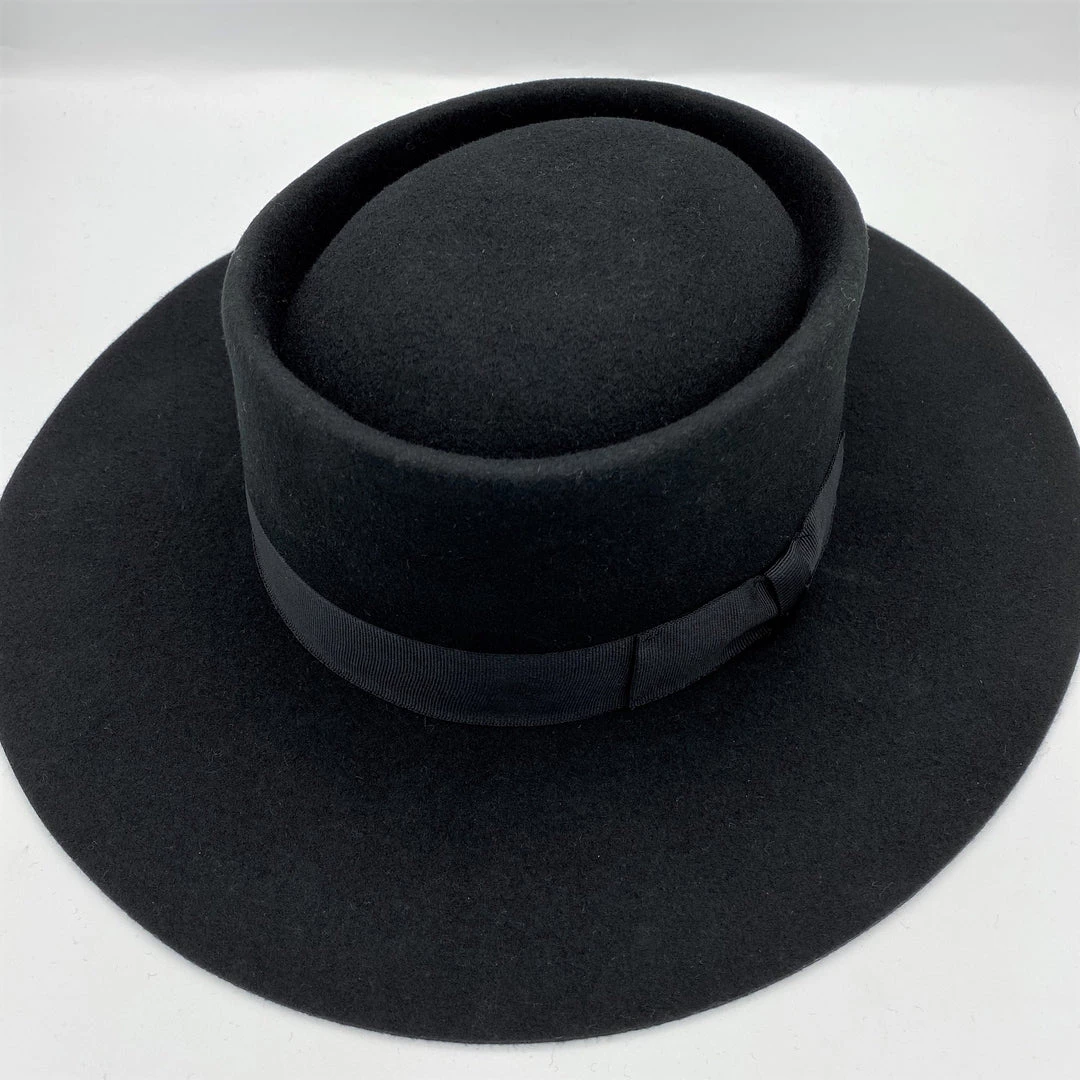 Hard brim wool felt boater with gambler crown. Matching grosgrain ribbon. 24″ circumference with drawstring adjustable inner band. 4″ crown height, 3.5″ brim width.