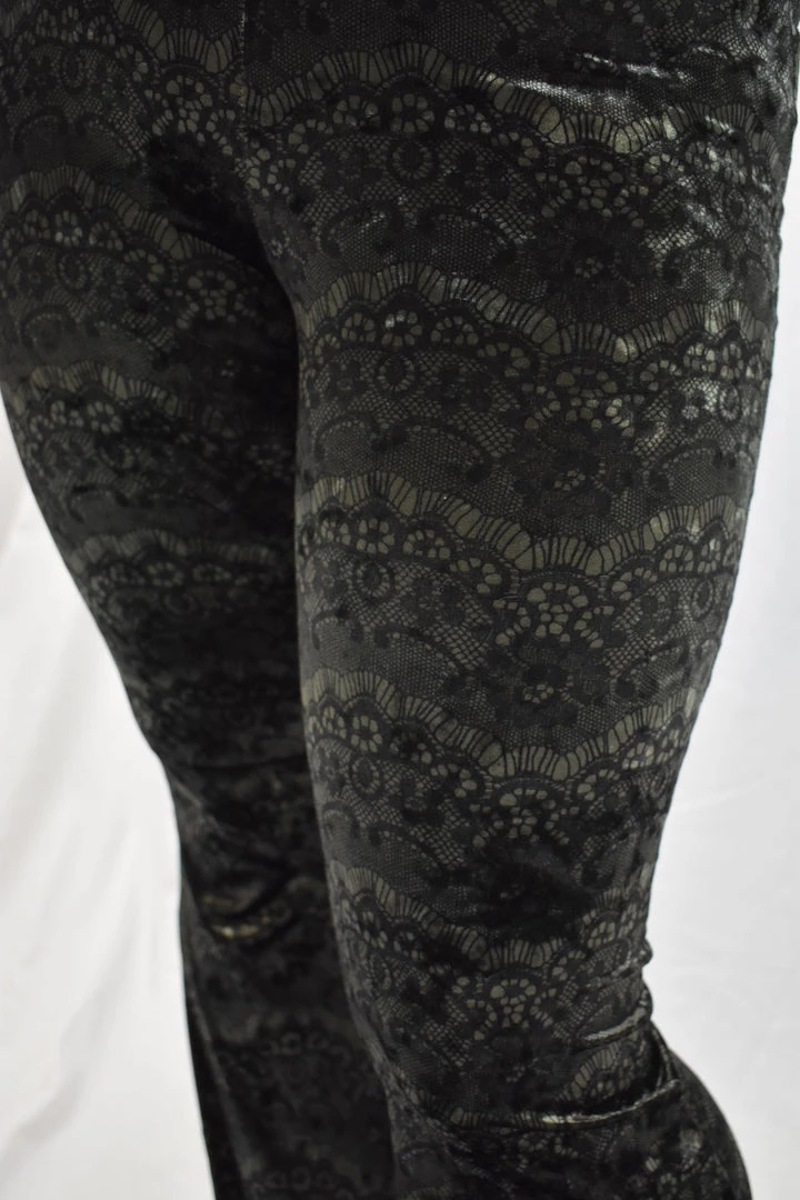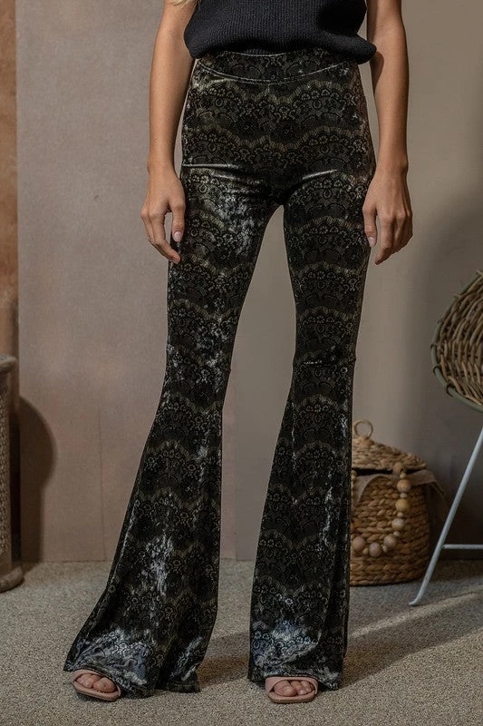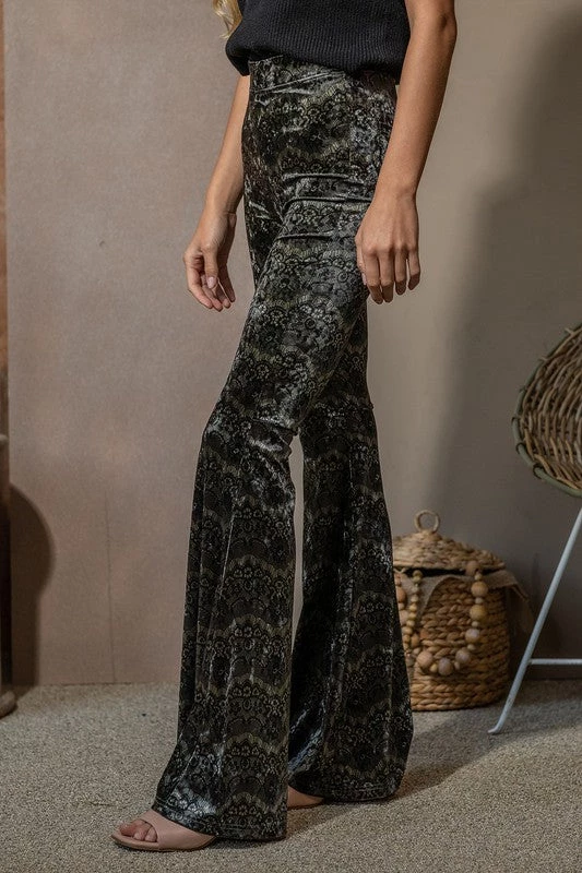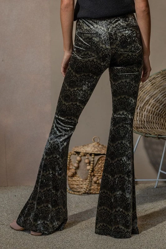 Olive green & black velvet lace print bell bottoms with back pockets. Runs small, but does have stretch! Size chart in photos.