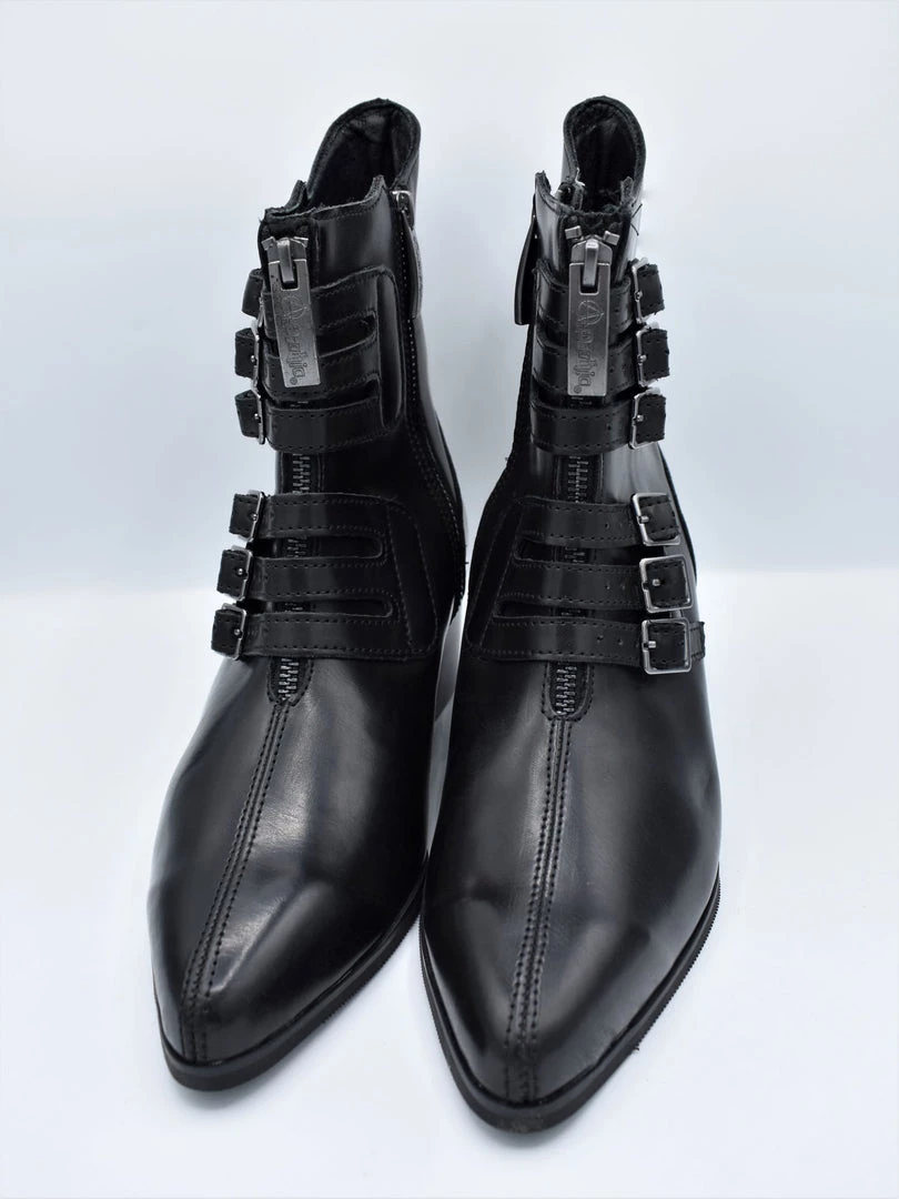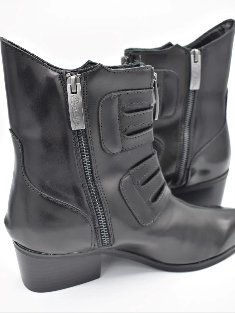 Perfect for a walk down a country lane or Main Street. Features a vegan friendly black faux leather upper with a pointed toe construction and 6-buckle closure. Has a block heel height of 2 ¼” and both front and side zippers for easy on/off wear.
