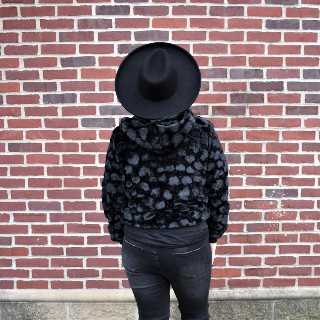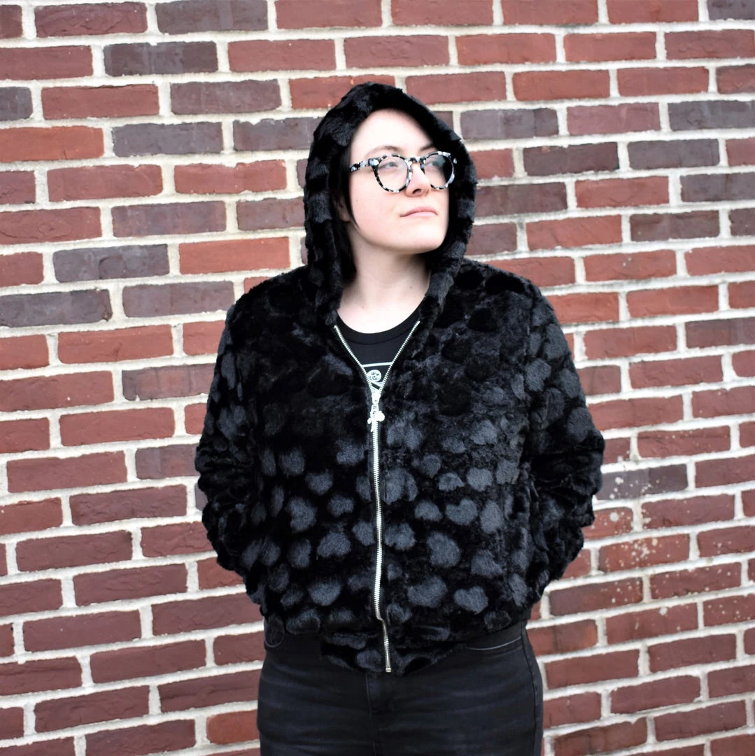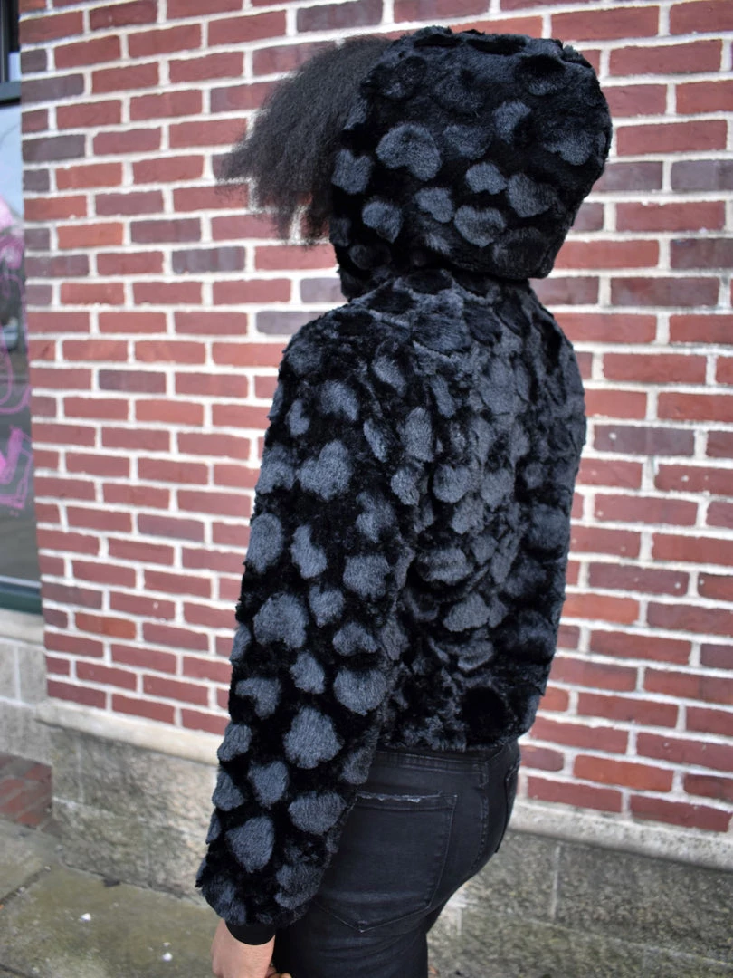 This super soft bomber is made out of black on black textured heart faux fur. Of course pockets and a matching hood!