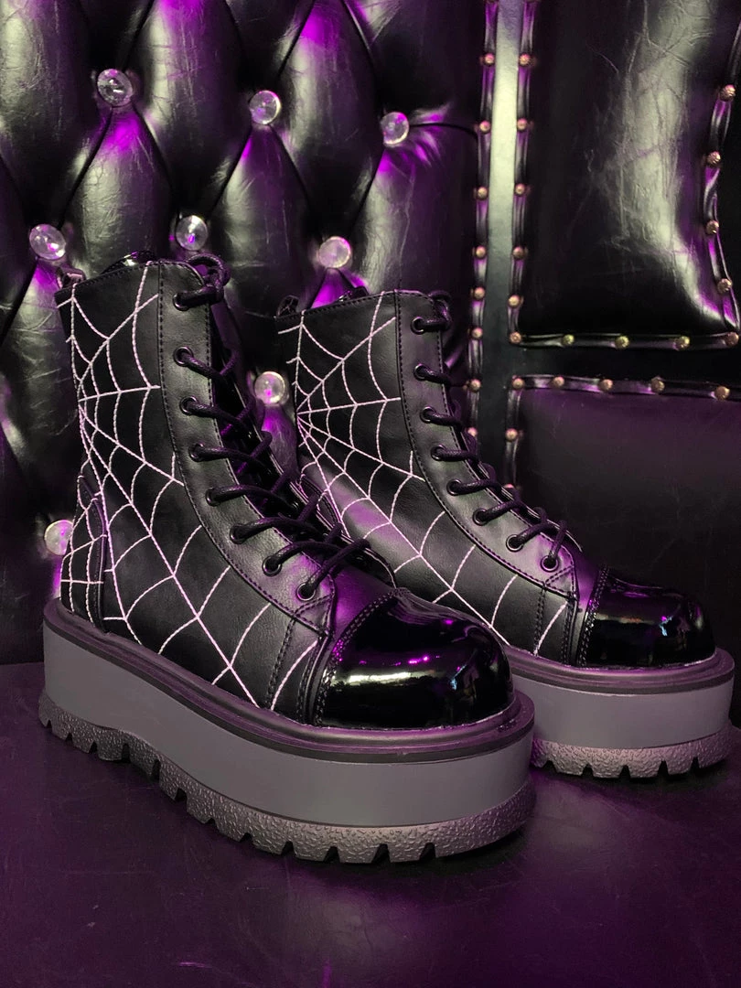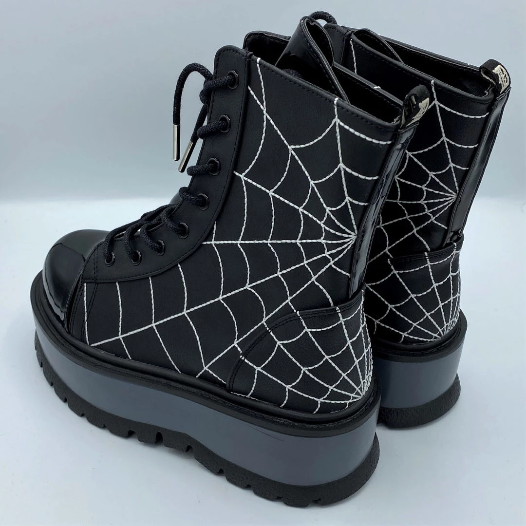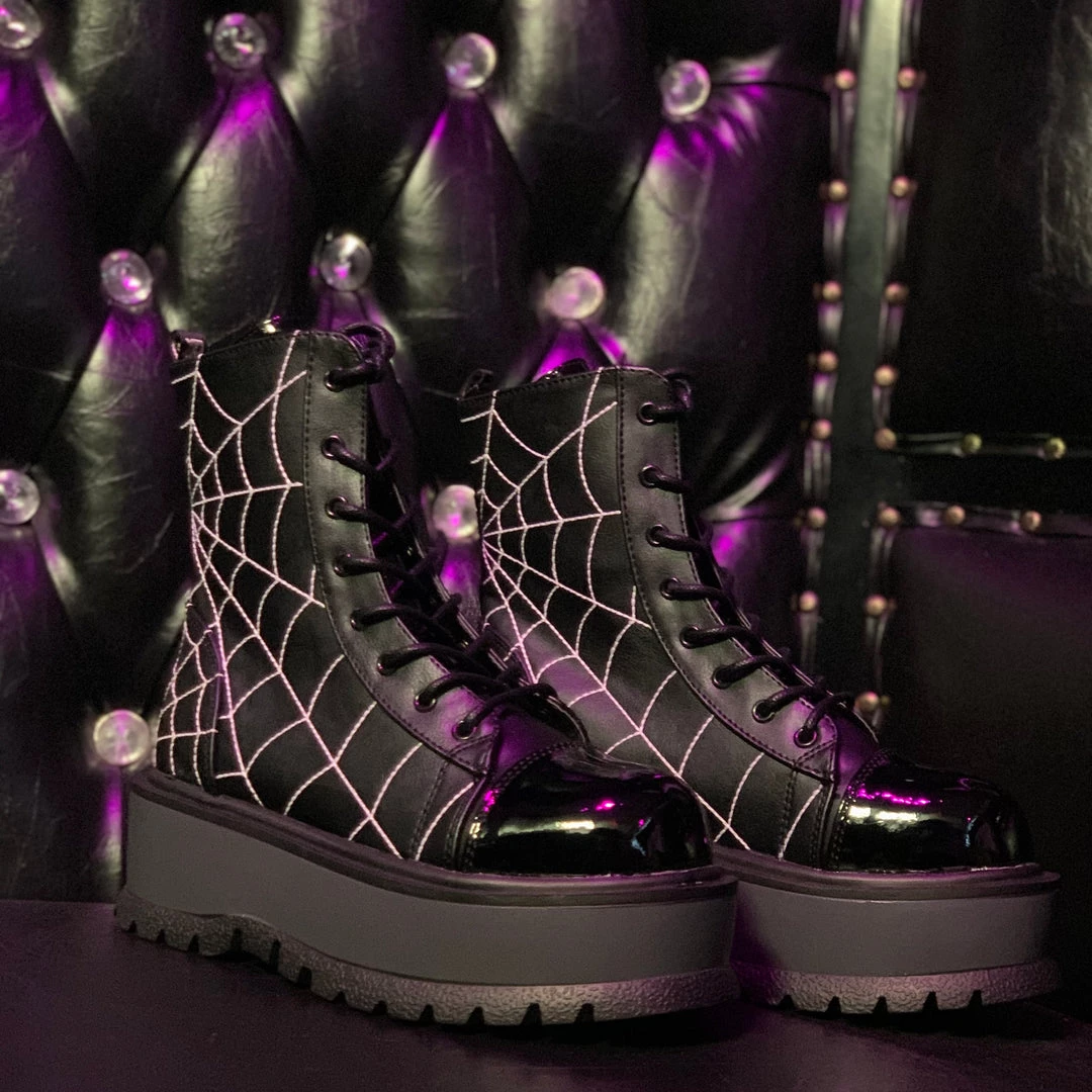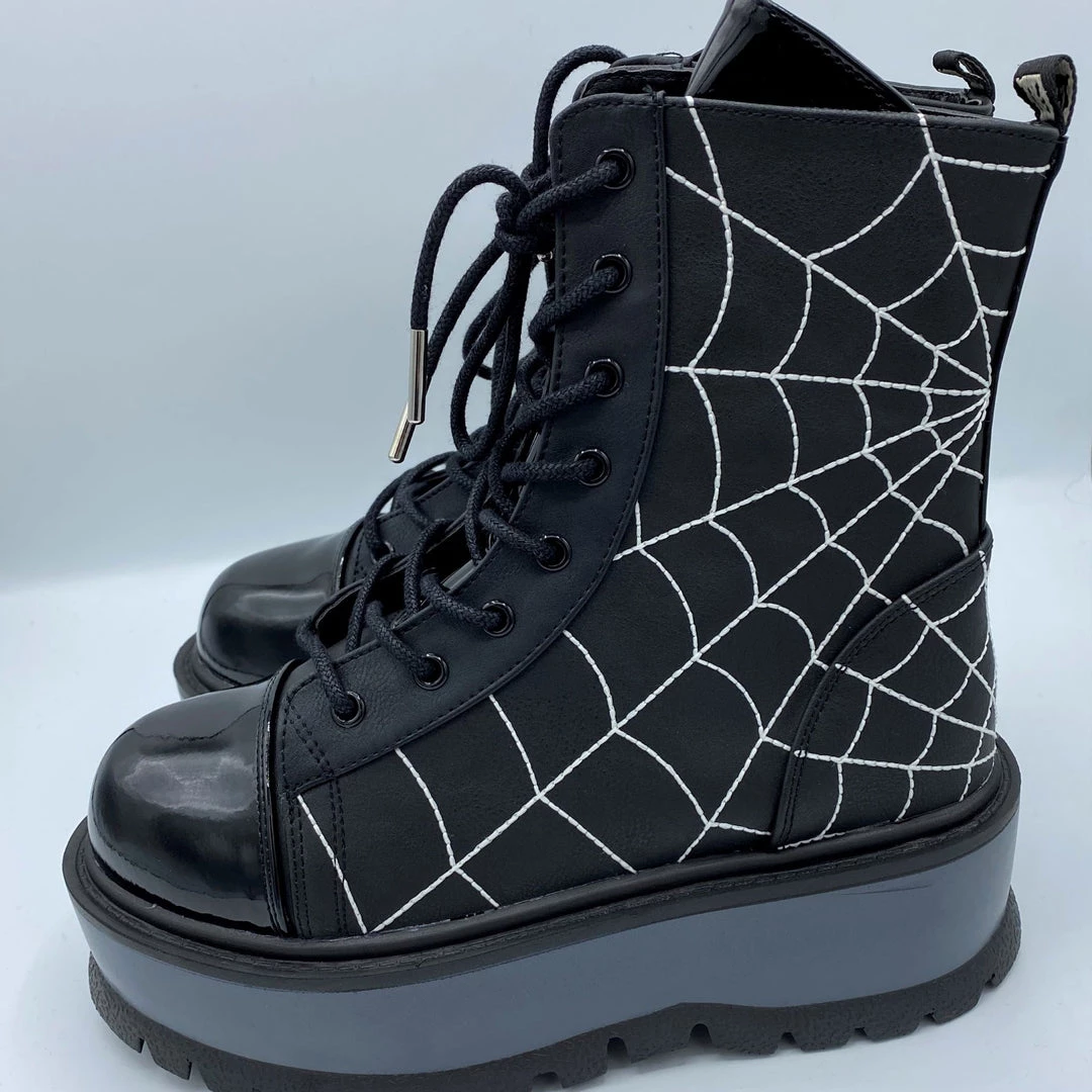Forever seeking out the dark corners full of spiderwebs. 2″ (51mm) Platform lace-up front, zip side ankle boot featuring embroidered spiderweb detail.
