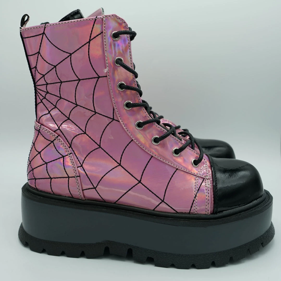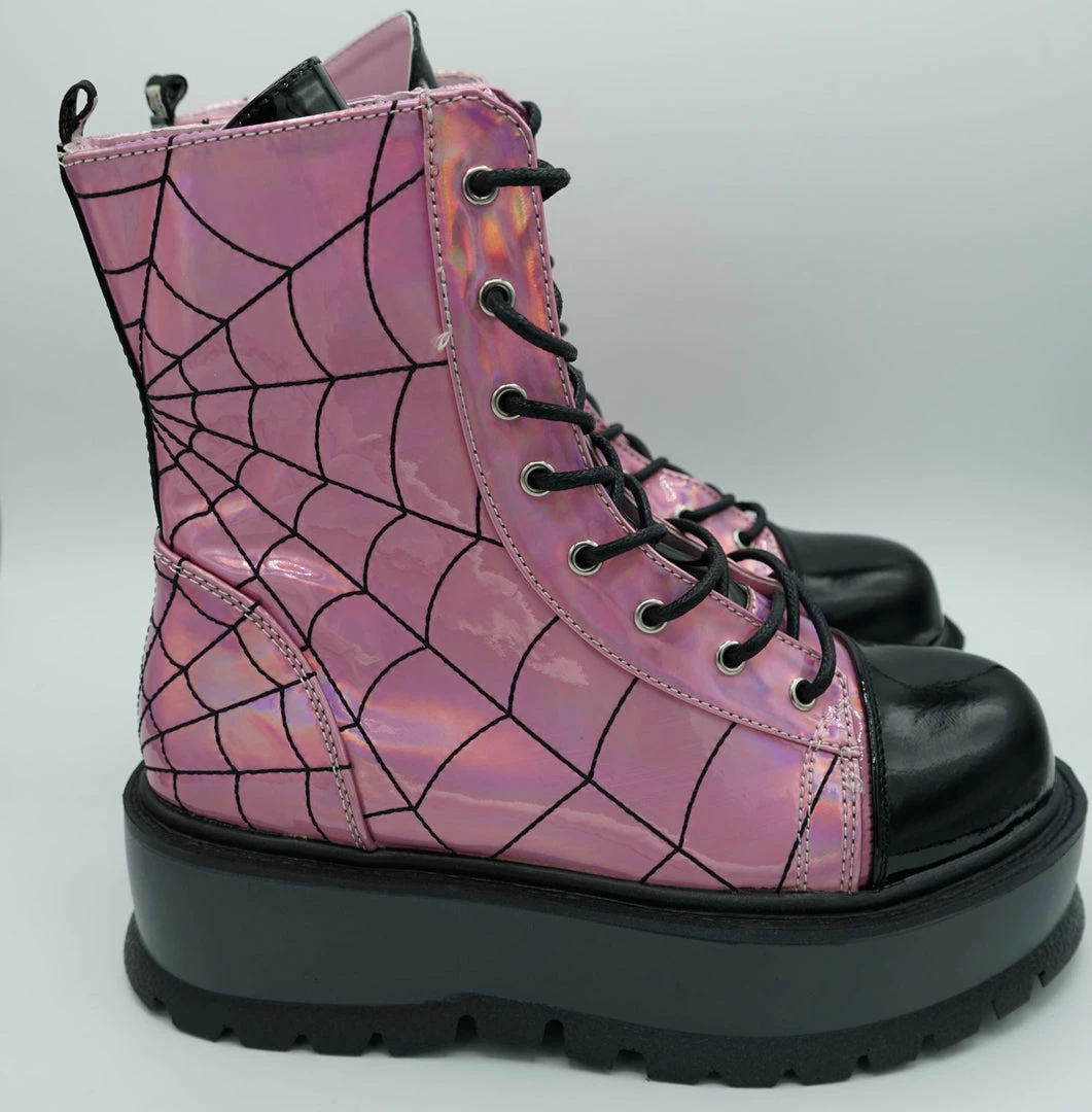 Forever seeking out the dark corners full of spiderwebs, but maybe this time filling that void with sweet iridescent pink! 2″ (51mm) Platform lace-up front, zip side ankle boot featuring embroidered spiderweb detail.