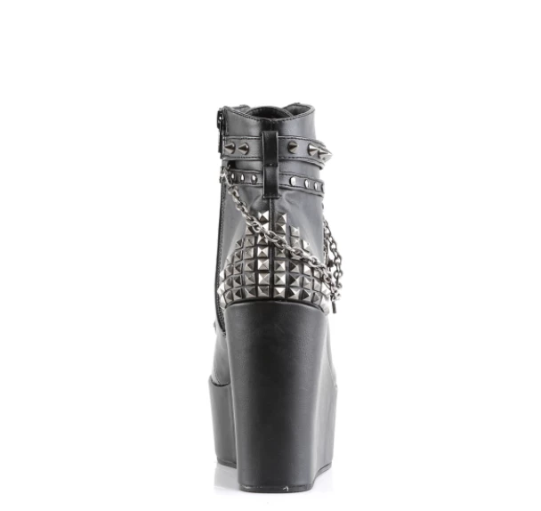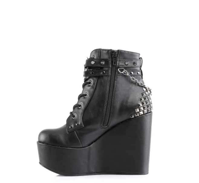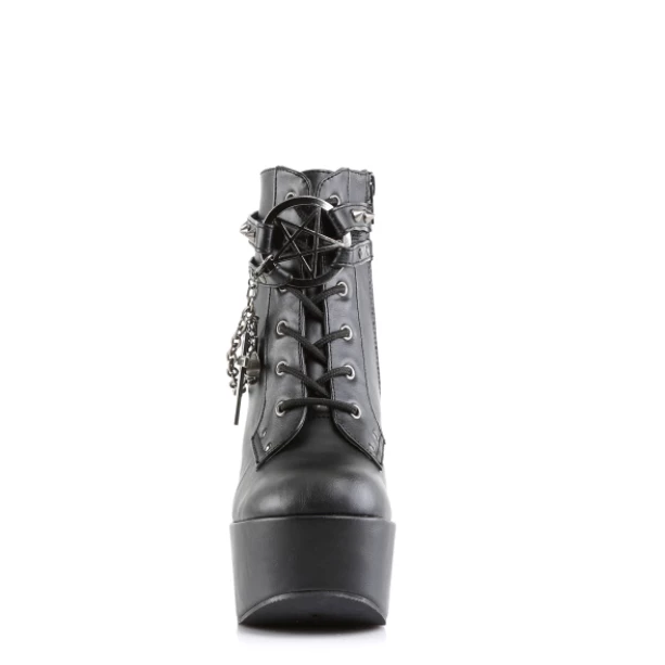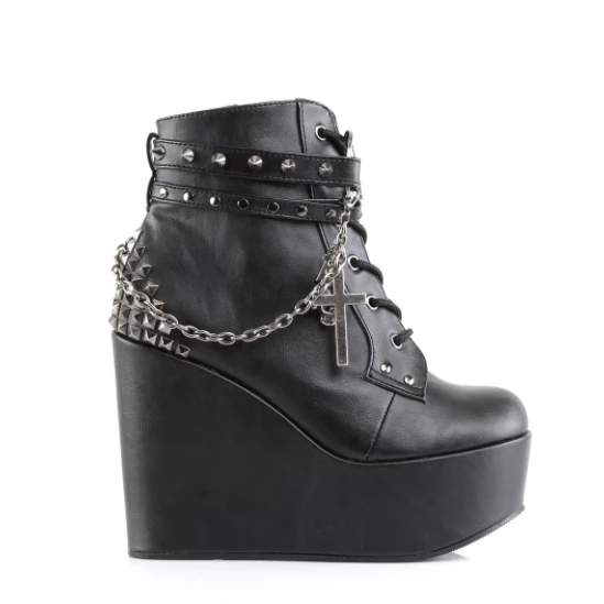 5″ (12.7cm) Wedge Platform Lace-Up Front Ankle Bootie Featuring Wrap Around Studded Straps with Pentagram Detail, Chain with Charms of Cross, Skull Head, Lighting, Safety Pen & Pyramid Studs at Back, Inside Zip Closure