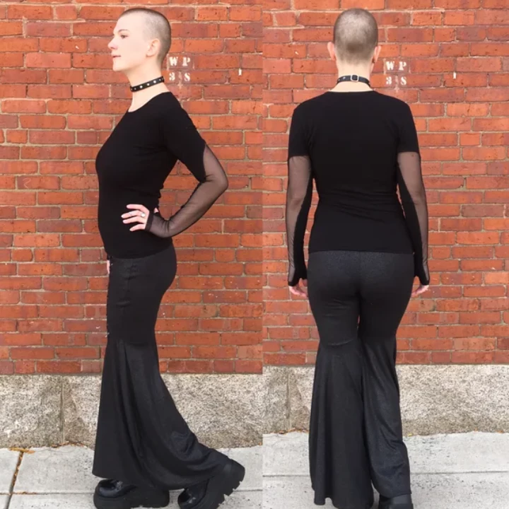 Black cotton lycra long sleeve shirt with thumbholes and sheer cutouts in the sleeves.