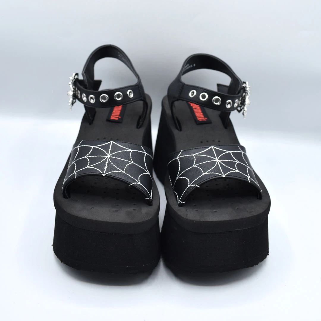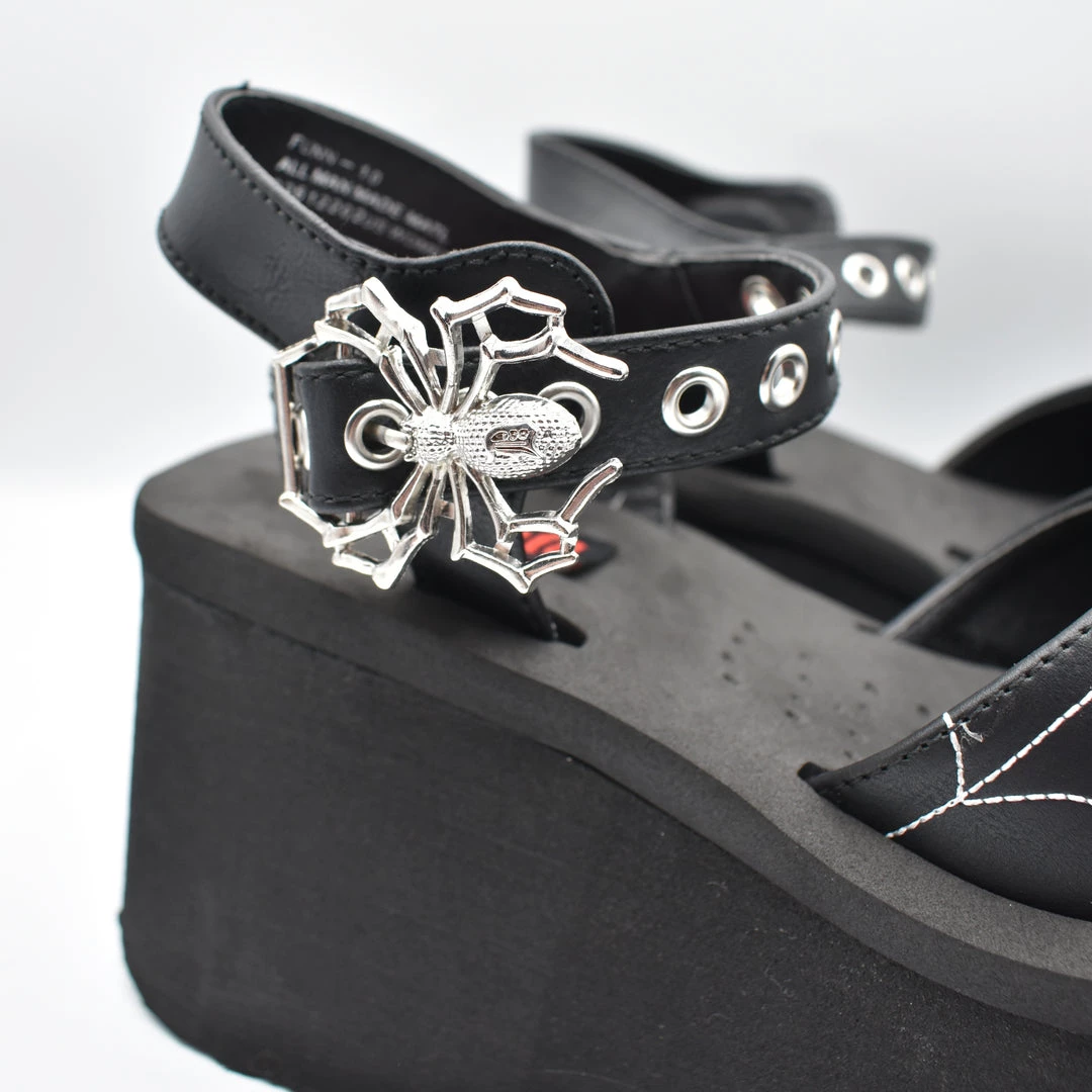 2 1/2″ platform sandals feature silver-toned spider shaped buckles on the adjustable ankle strap and spider web embroidery on the vamp.