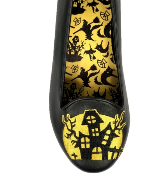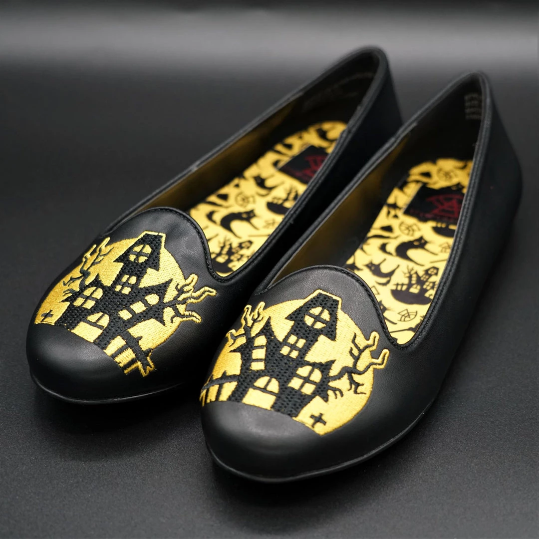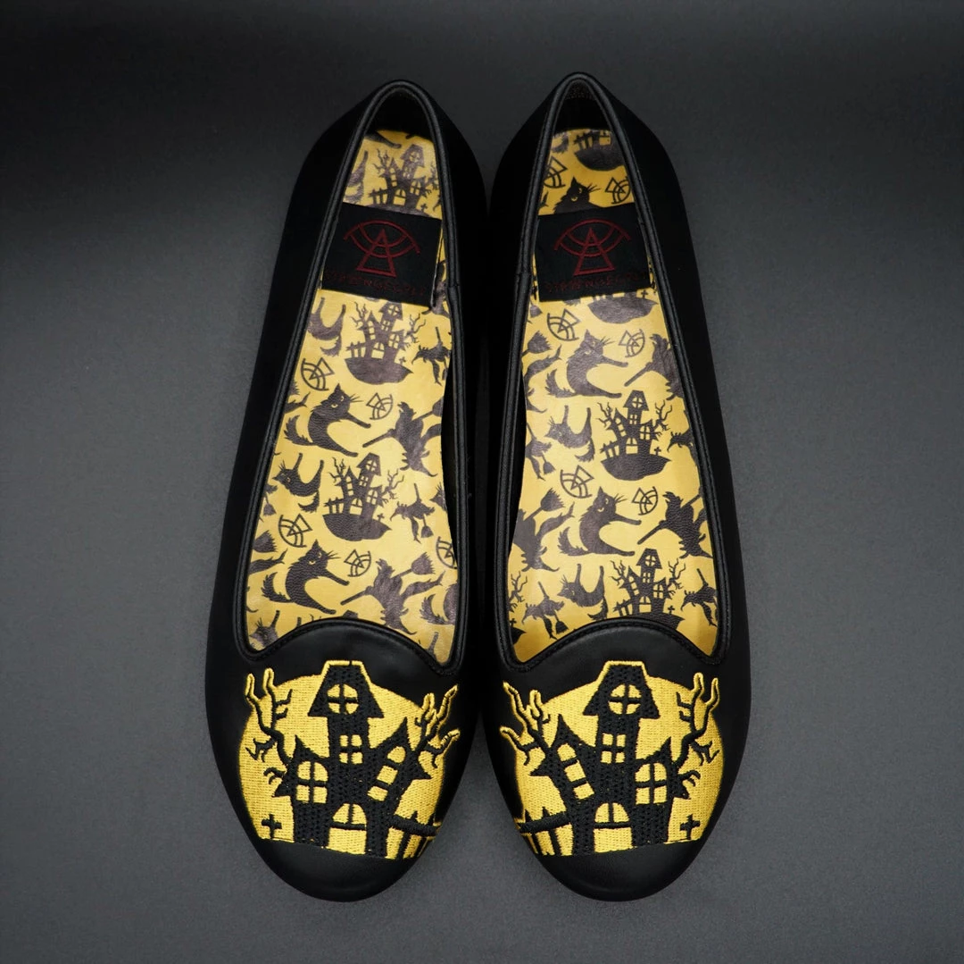 These adorable vegan flats by our friends at Strangecvlt are the absolute cutest, featuring an embroidered haunted house, these shoes are just the thing we needed to complete our favorite spooktacular outfits! Extremely limited!!!