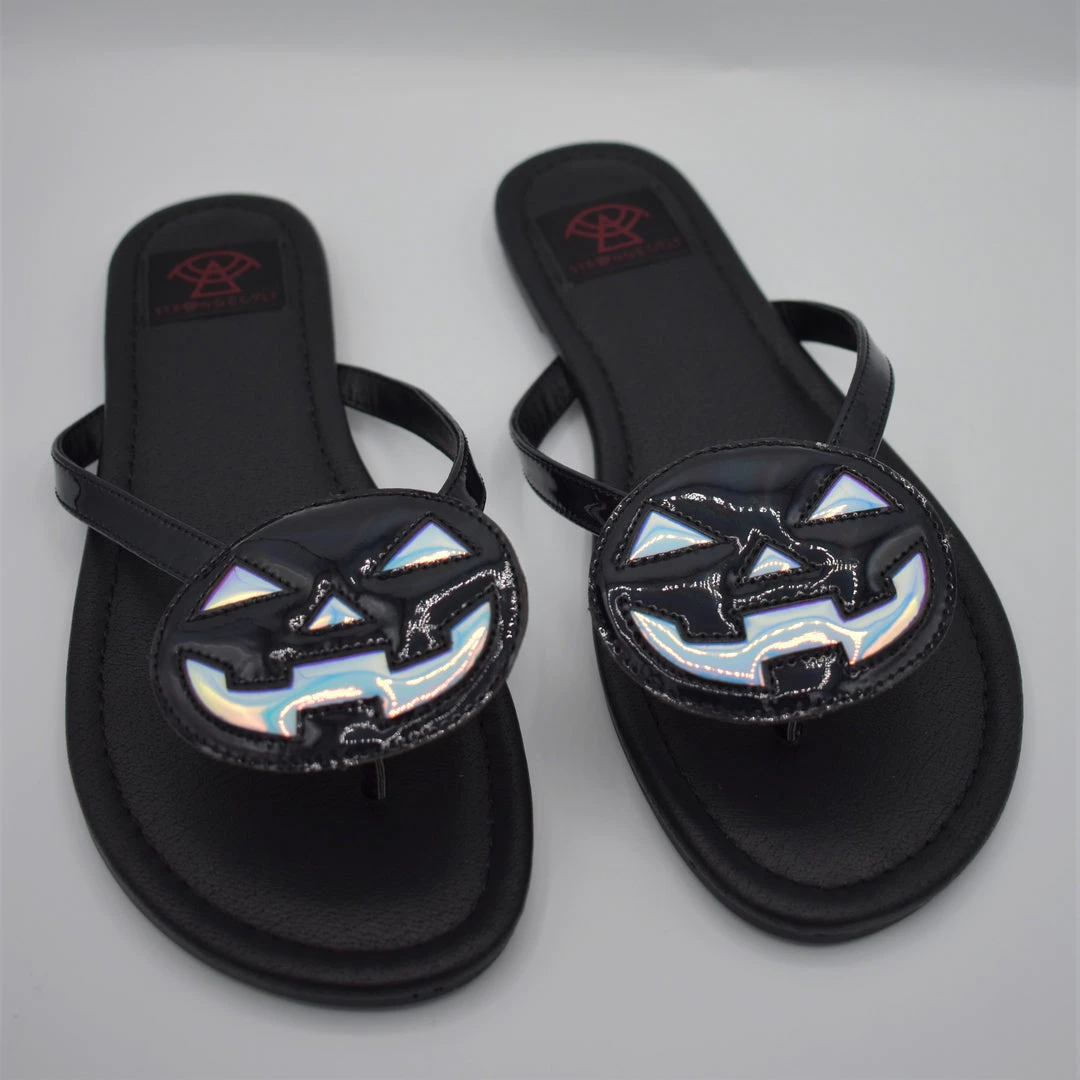 We are ready for warm weather with these incredibly cute flip flops from our friends at Strangecvlt! Featuring a shiny black jack o’lantern with holographic atlantis face on the strap!