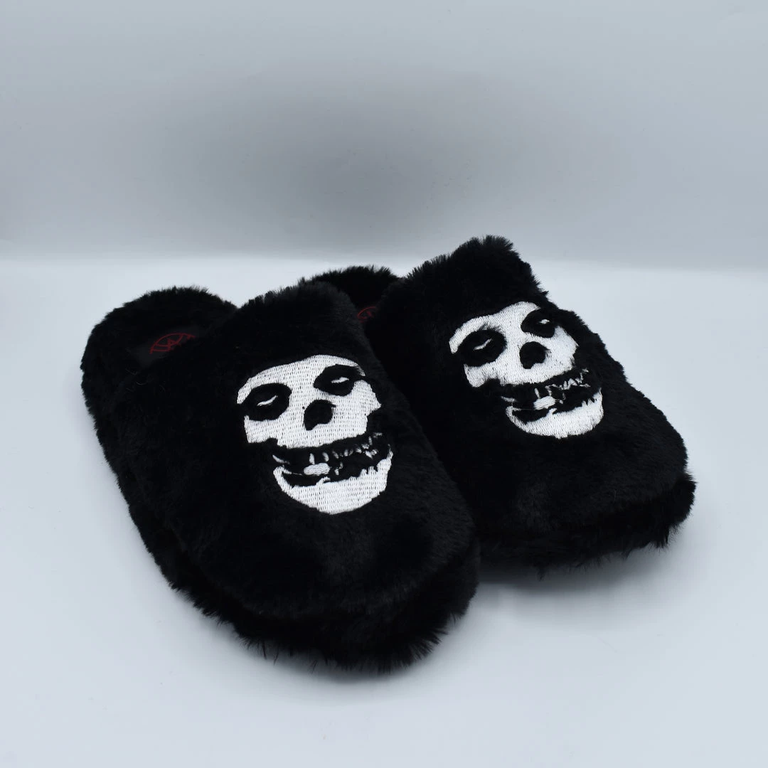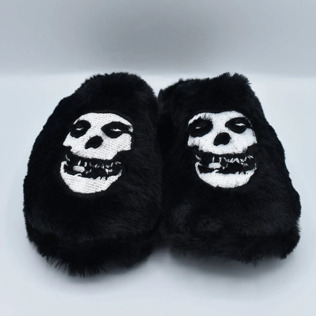 A total punk, but the cozy on the couch kind. This plush indoor house slipper features a black fuzzy upper with Misfits skull embroidery and a rubber bottom. Comes in a poly bag, no shoebox.