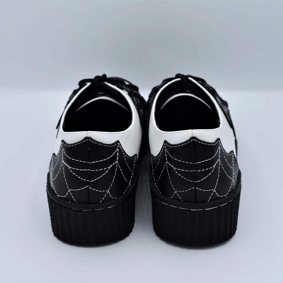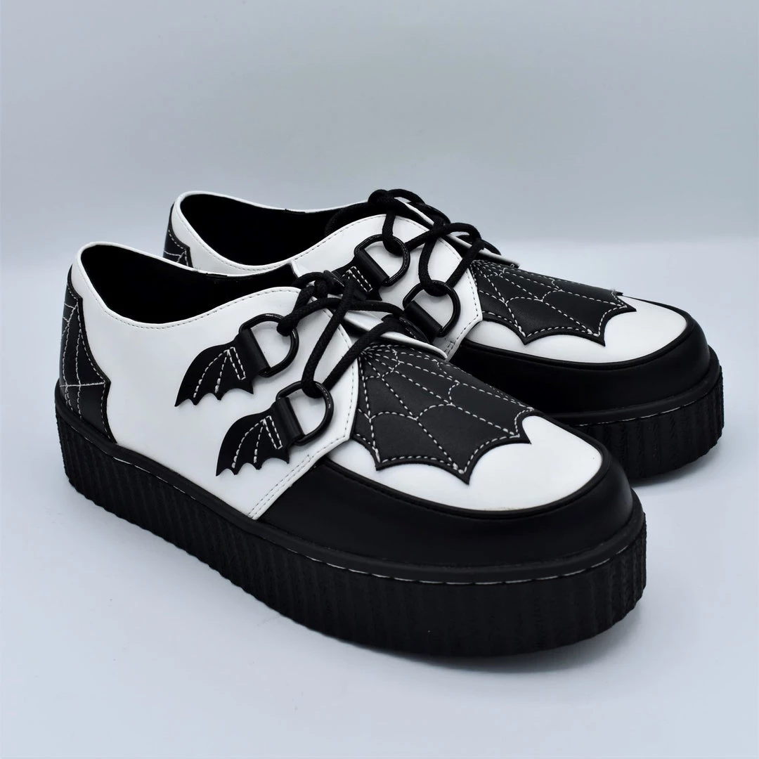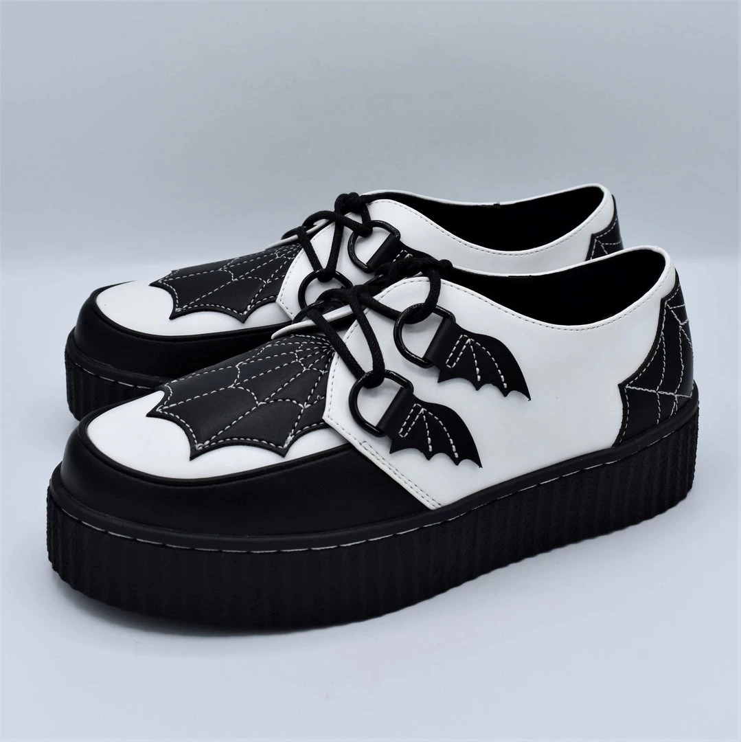 A take on the classic black and white saddle shoe, these creepers have a white vegan leather upper with black vegan leather bat wings and spiderwebs.
