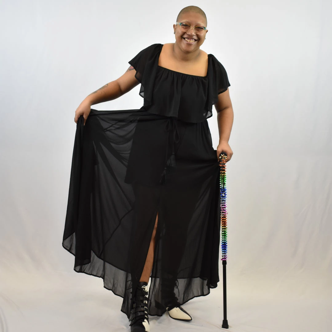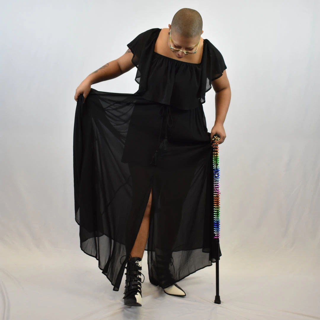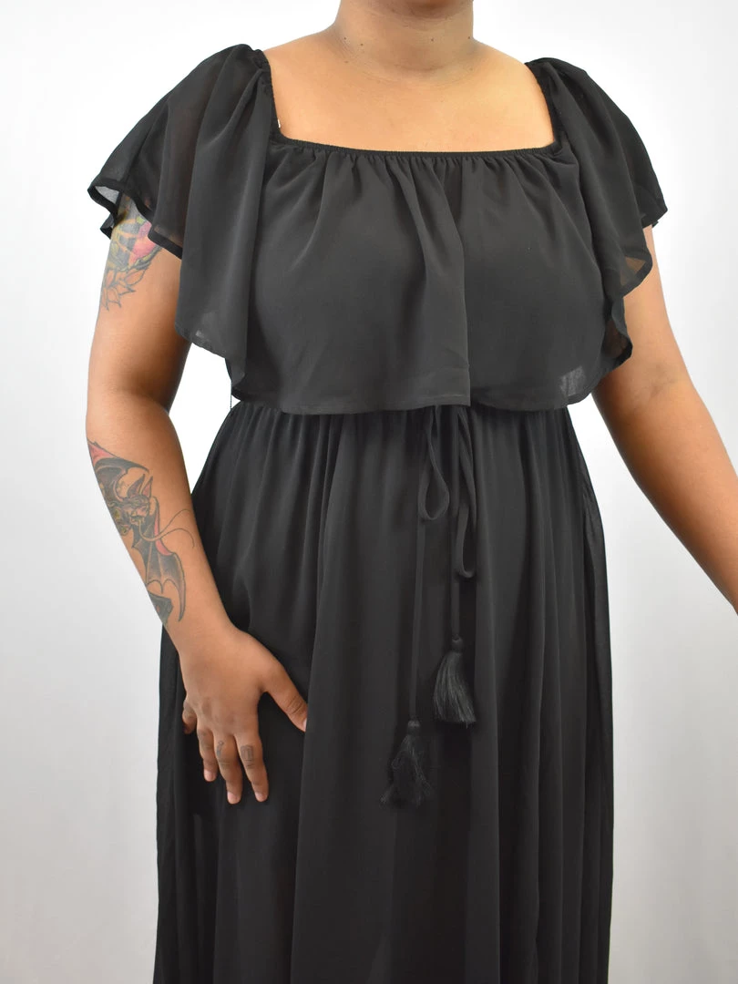 This is it! The dramatic summer maxi dress of our dreams! Long and flowy, this sheer piece is drapes beautifully and has a slit at the leg to add a little extra breeziness. It is sheer all the way through, but has an attached mini skirt underneath, so you can wear with or without shorts! The top is also sheer, so you can wear over a bra or a tank top or bodysuit, you can see through the underneath but the frill around the neck makes the bust totally opaque. A tie-belt is included with pretty tassels for a little something extra.
