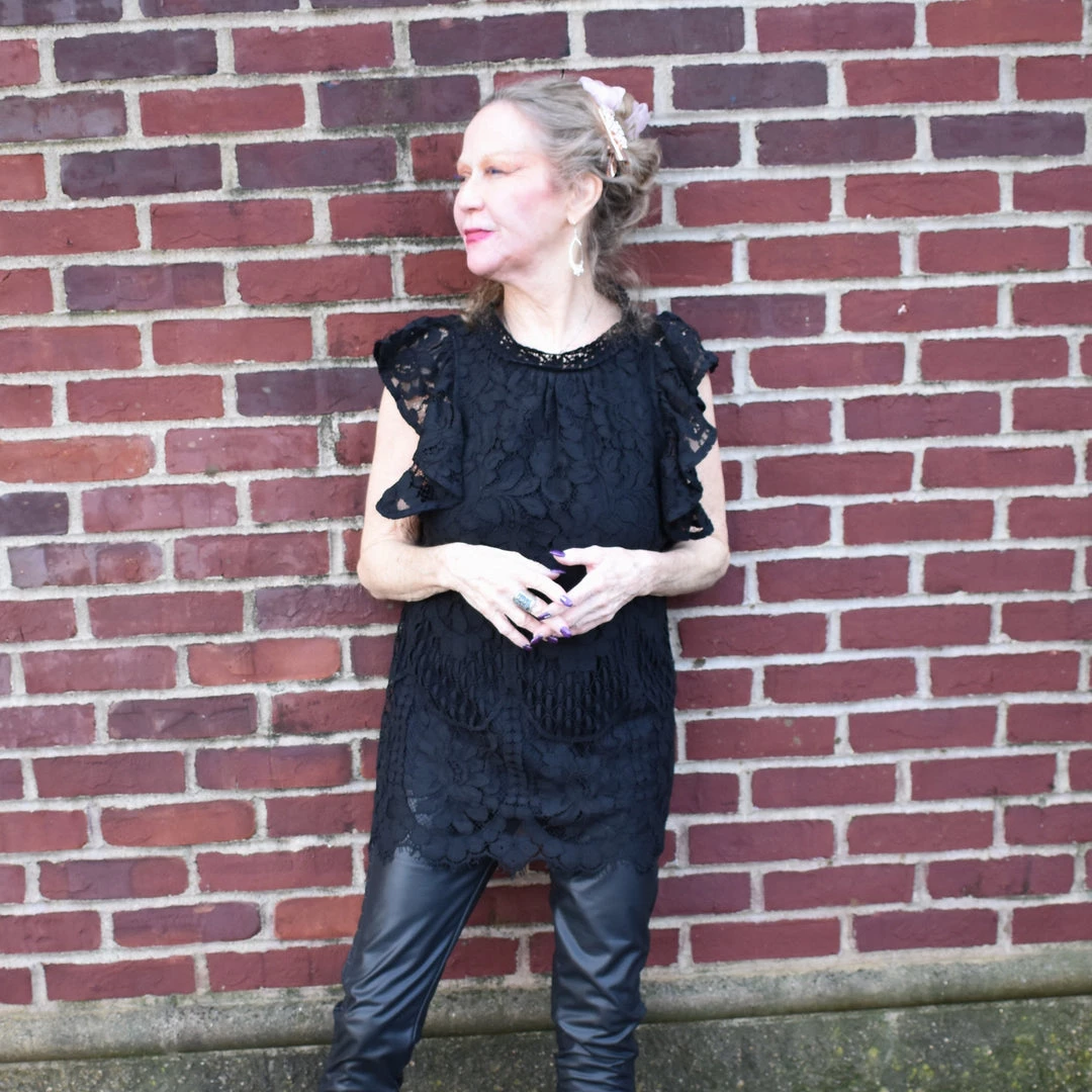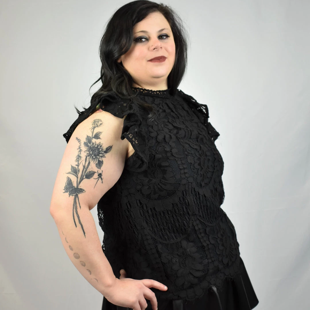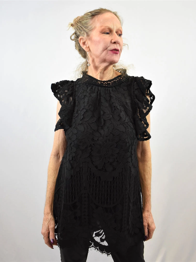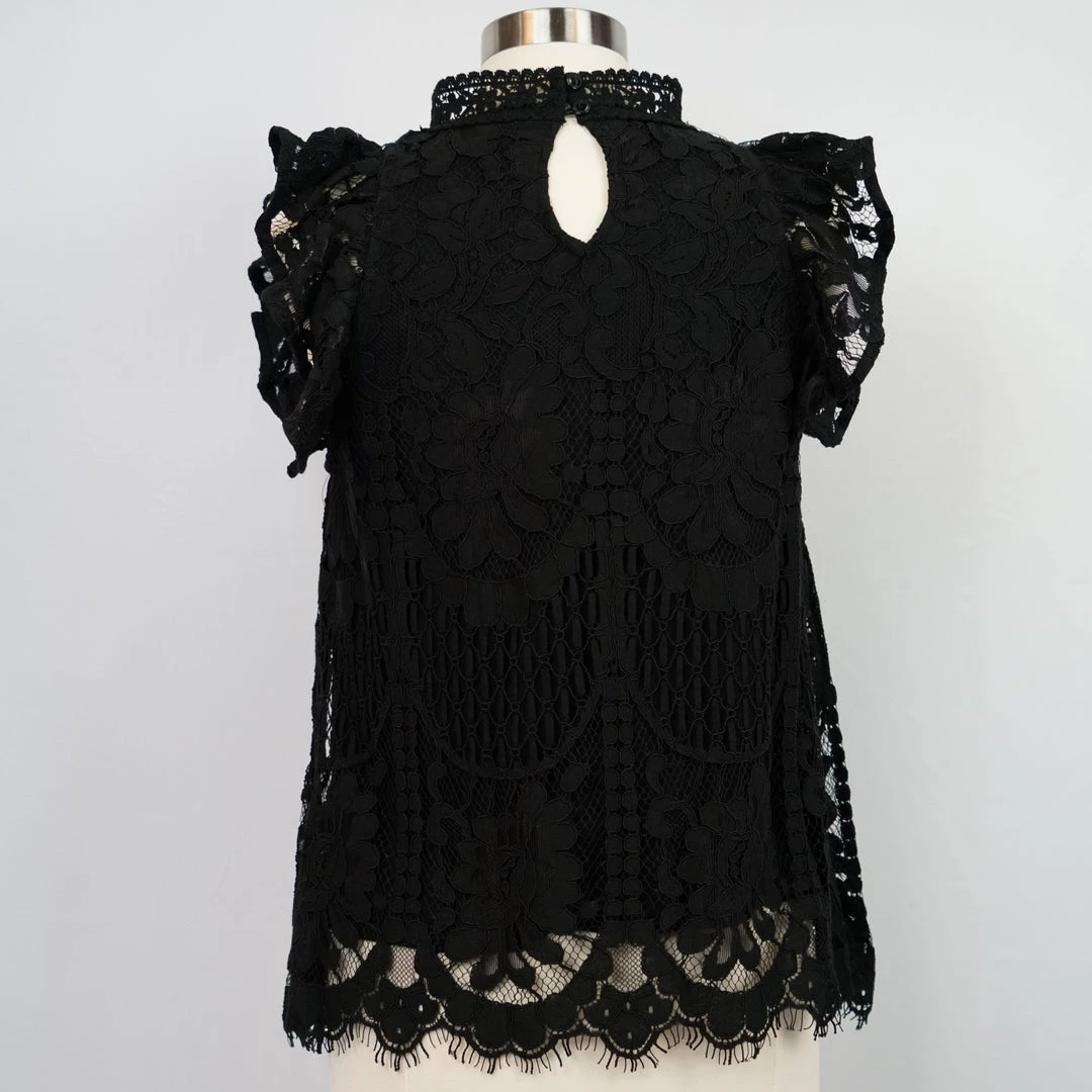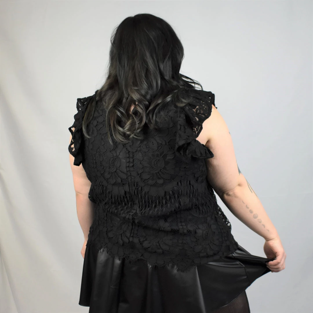 Perfect for wandering the halls of your favorite crumbling mansion, this all-over lace shirt has a ruffle sleeve, scalloped hem, and solid fabric lining. This garment does not have stretch.