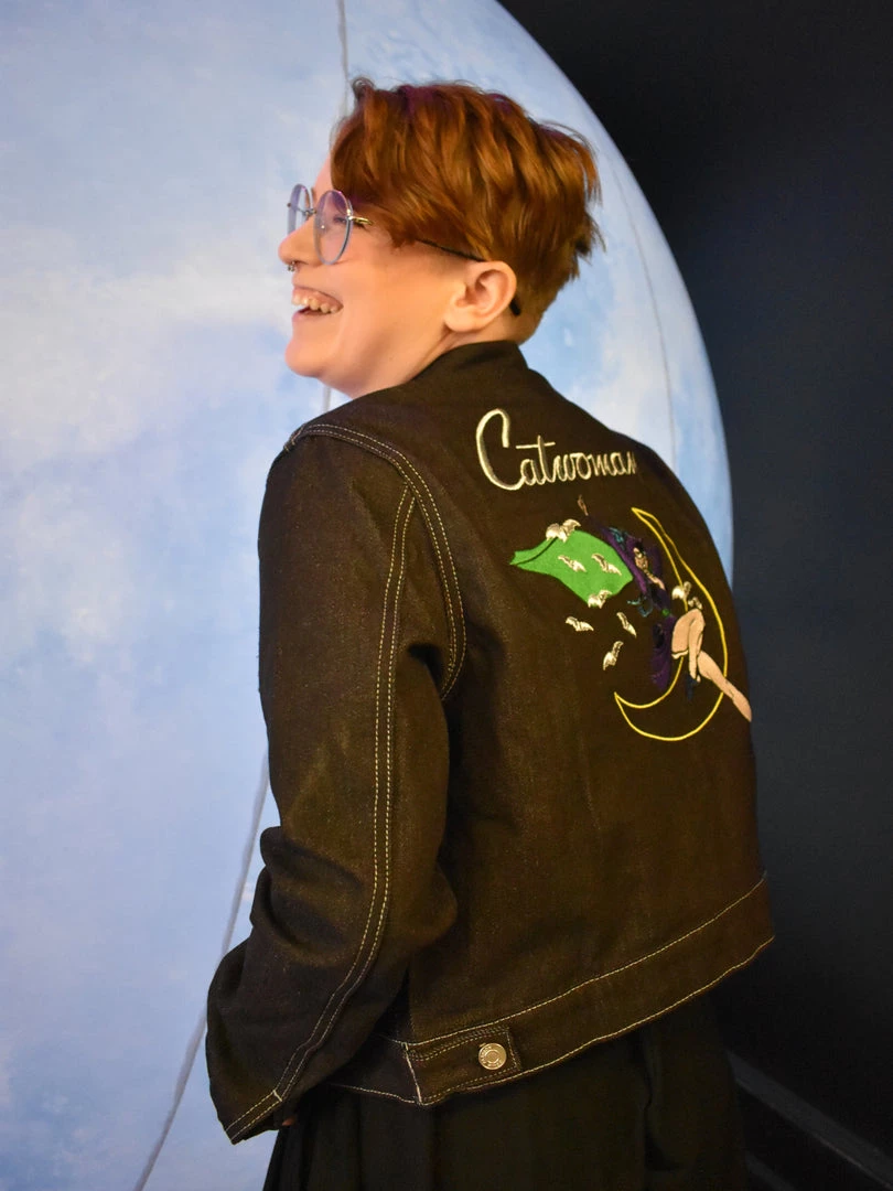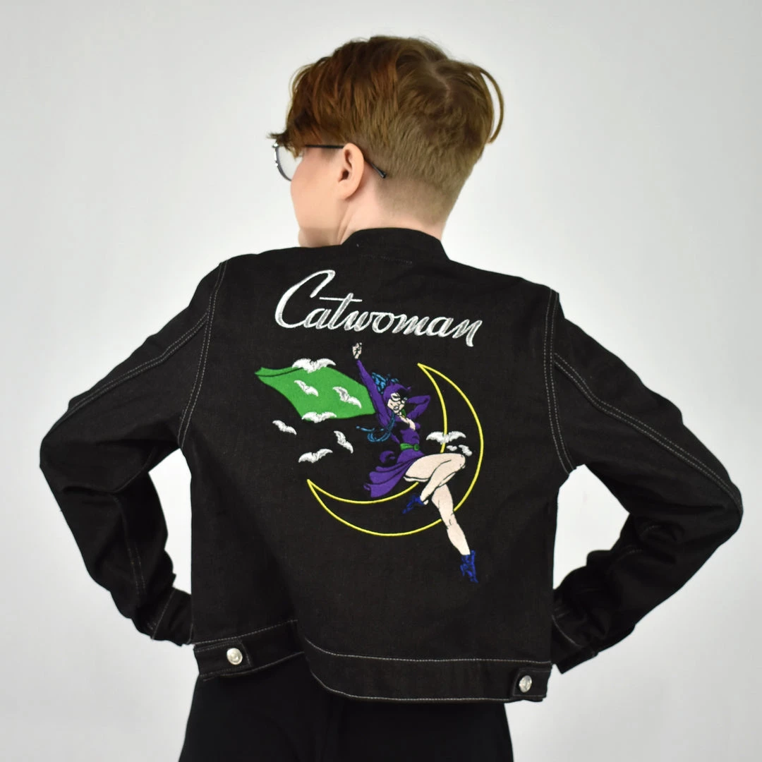 This jean jacket is crafted in black denim with contrast stitching and features an embroidered design on the back showcasing the infamous DC Comic heroine, Catwoman.